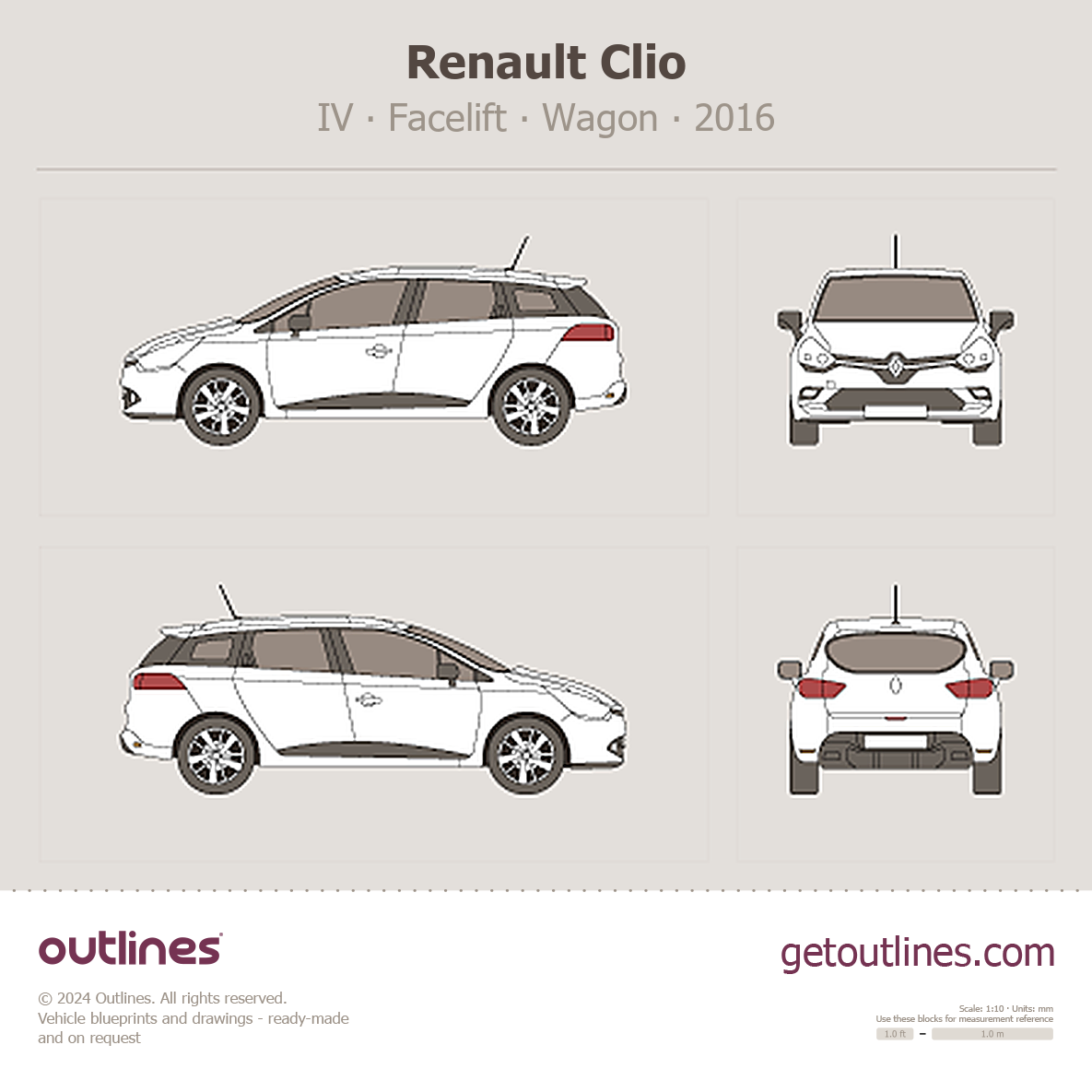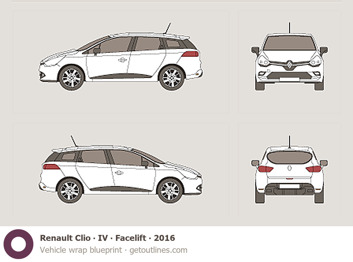 This 2016 Renault Clio IV Facelift Wagon blueprint helps designers, wrap studios, and 3D artists simplify their workflow and save valuable time for creative work instead of routine tasks.