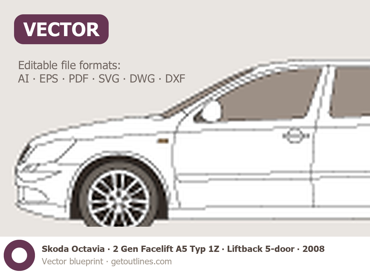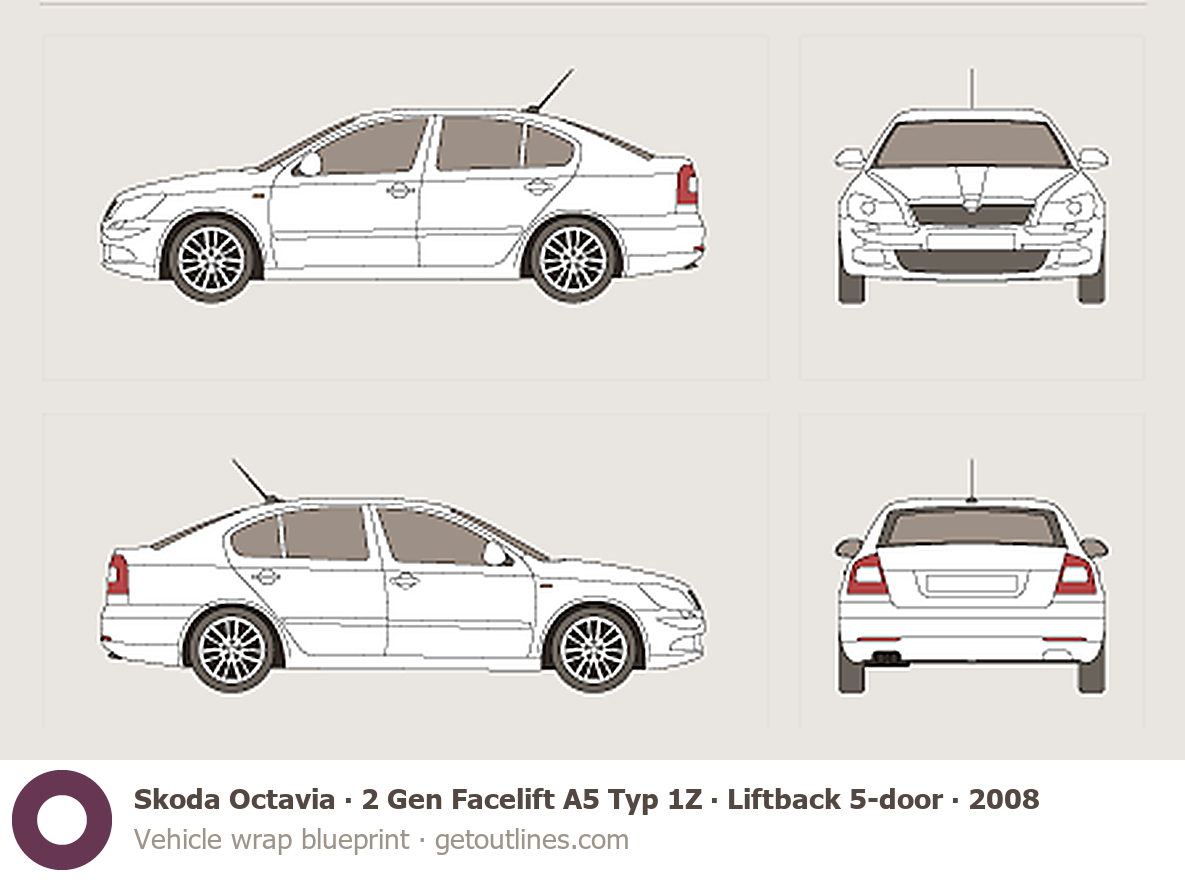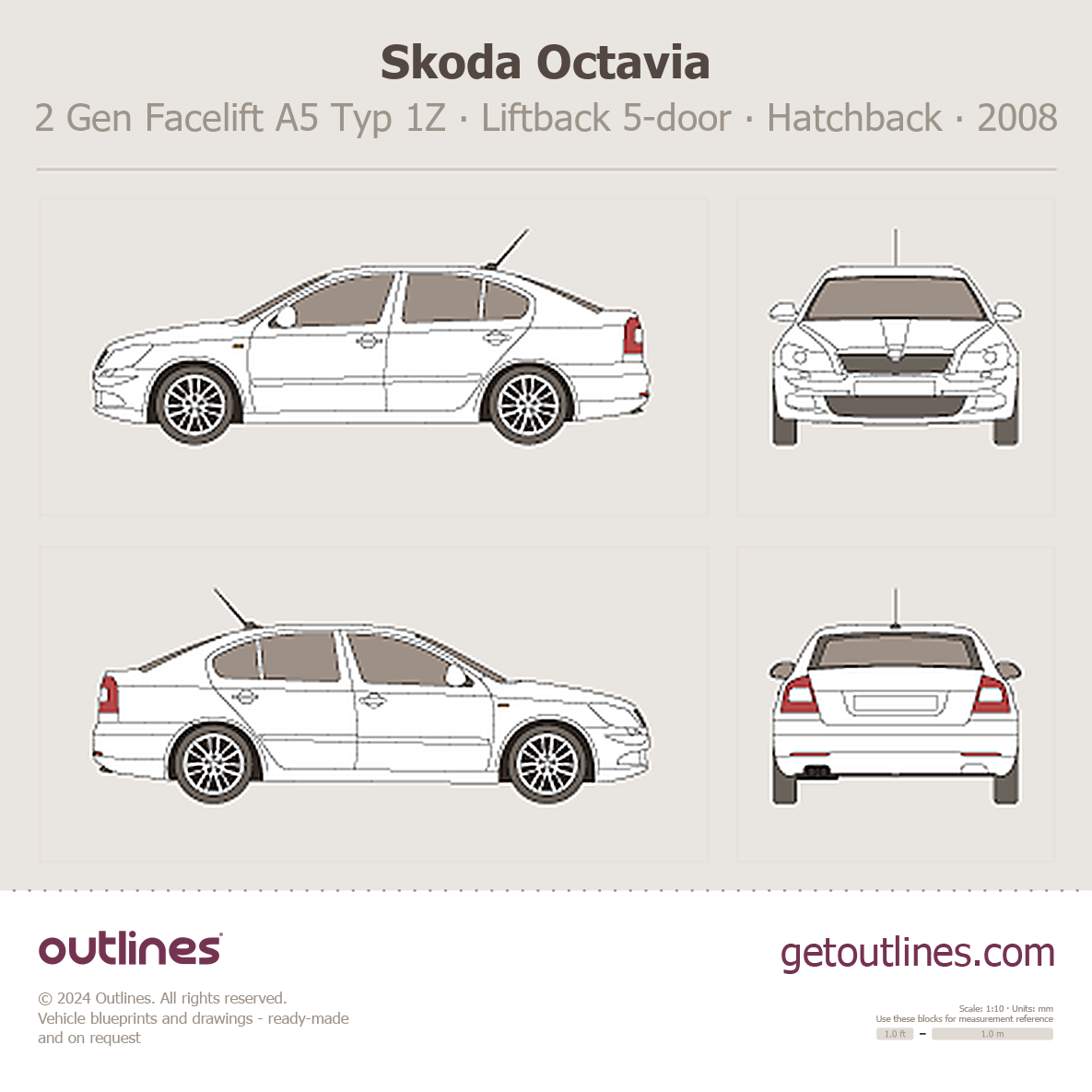 This 2008 Skoda Octavia 2 Gen Facelift A5 Typ 1Z Liftback 5-door Hatchback blueprint helps designers, wrap studios, and 3D artists simplify their workflow and save valuable time for creative work instead of routine tasks.