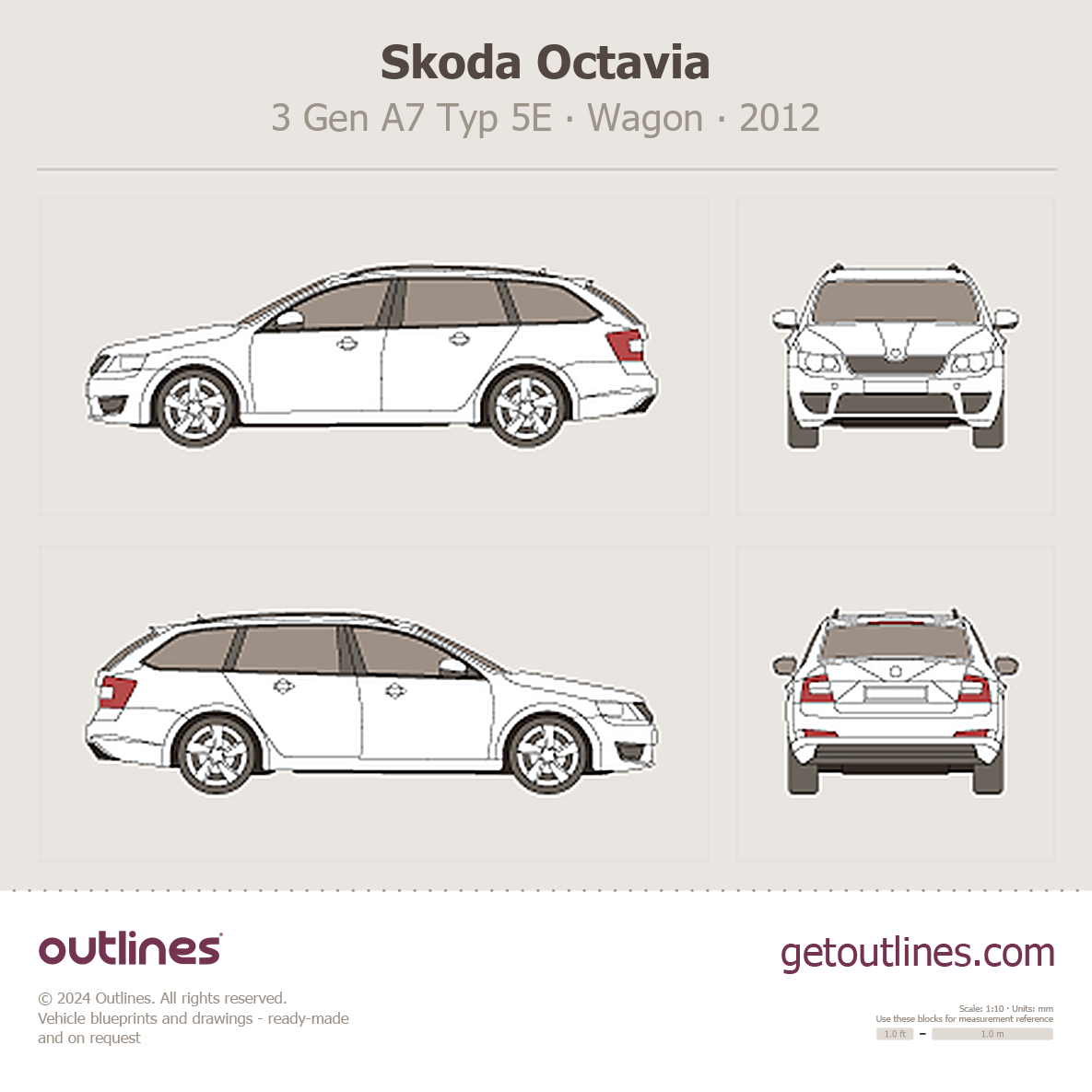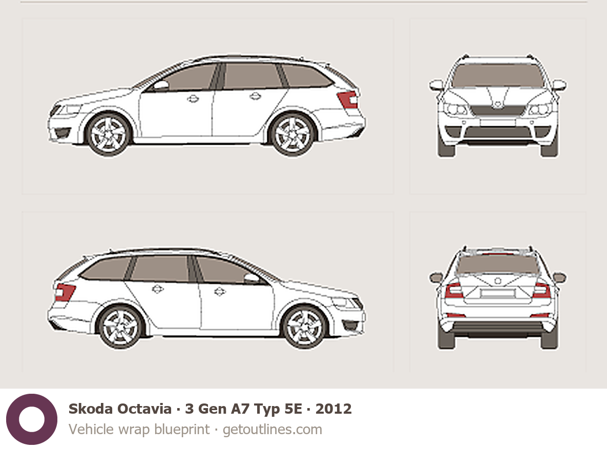This 2012 Skoda Octavia 3 Gen A7 Typ 5E Wagon blueprint helps designers, wrap studios, and 3D artists simplify their workflow and save valuable time for creative work instead of routine tasks.