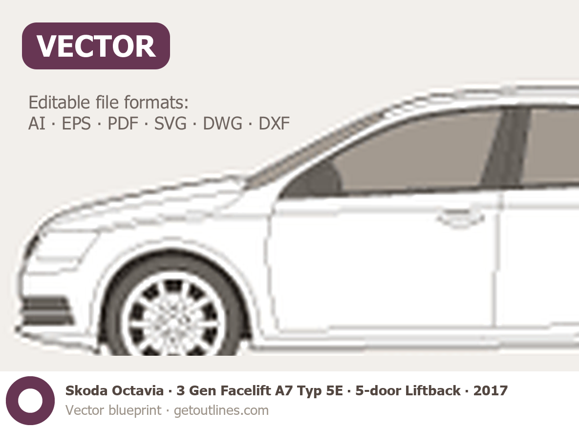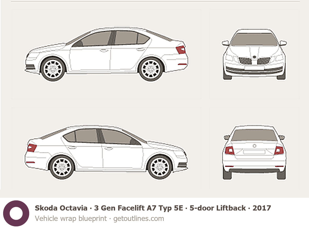 Buy this Skoda Octavia 3 Gen Facelift A7 Typ 5E blueprint and line drawing in high-quality editable vector file formats. Best for 3D and car wrap design.