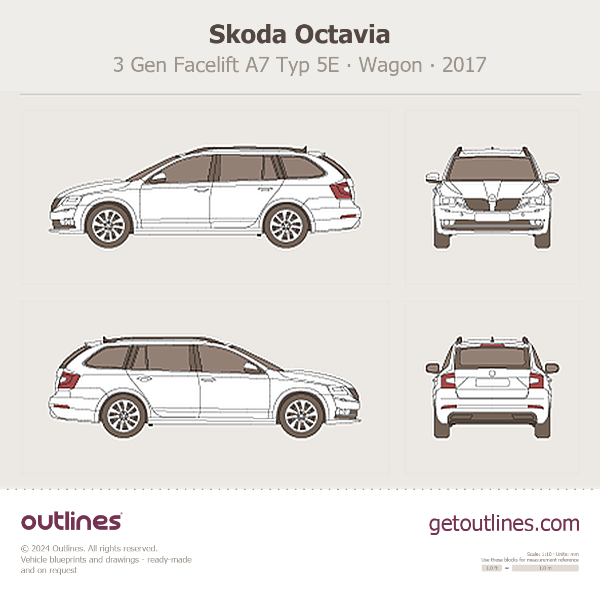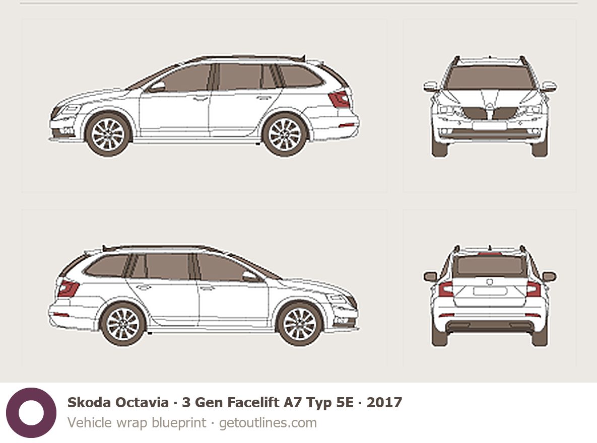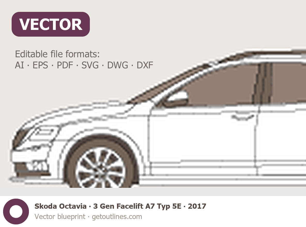Buy this Skoda Octavia 3 Gen Facelift A7 Typ 5E blueprint and line drawing in high-quality editable vector file formats. Best for 3D and car wrap design.