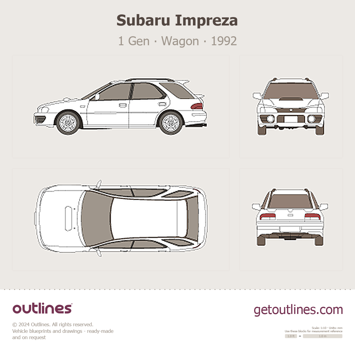 This is a blueprint of the Impreza, produced by carmaker Subaru in 1992 - 2000. It features a Wagon body design and is classified as a Family vehicle.