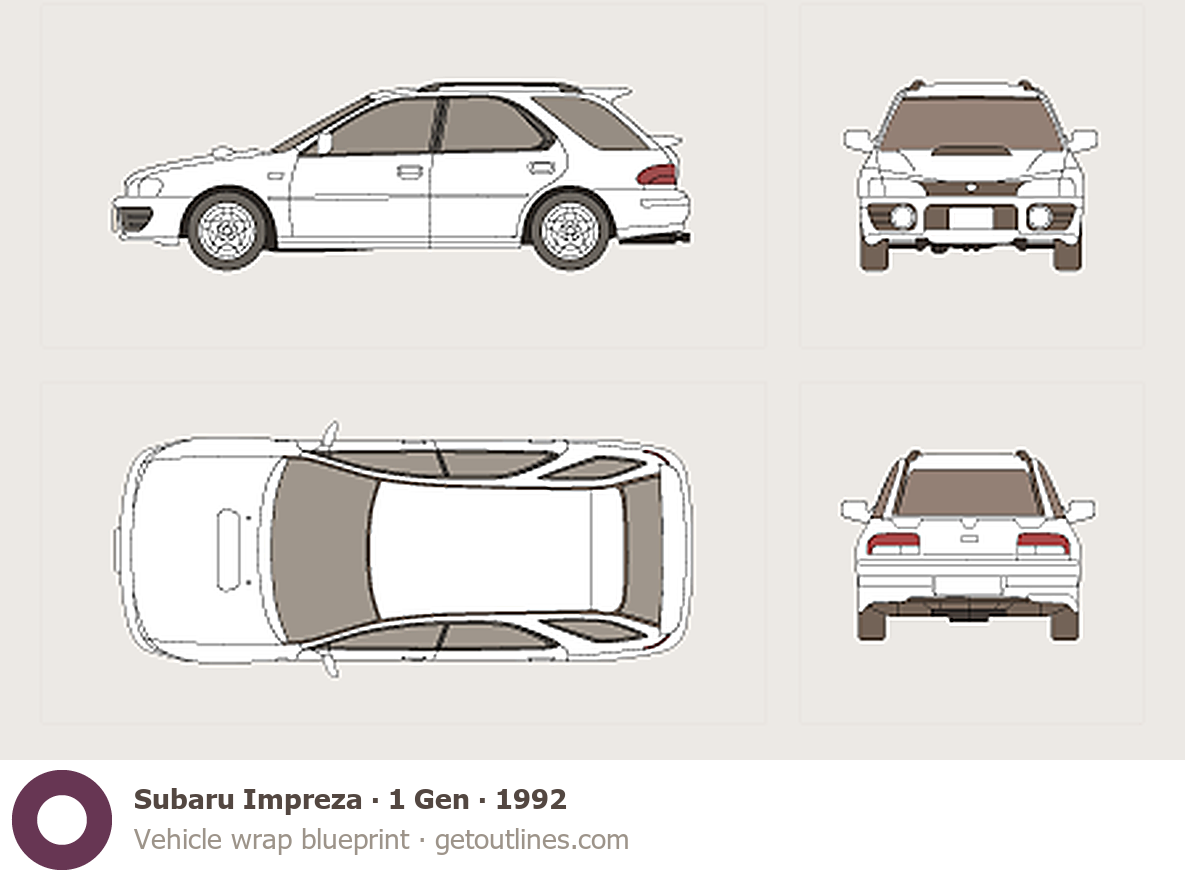 This template is suitable for Subaru Impreza models from 1992 to 2000, including 1992, 1993, 1994, 1995, and 2000 model years, and is commonly used for vehicle wrap and signage design.