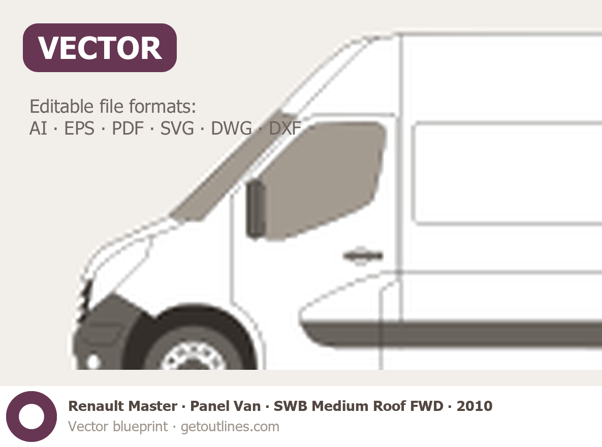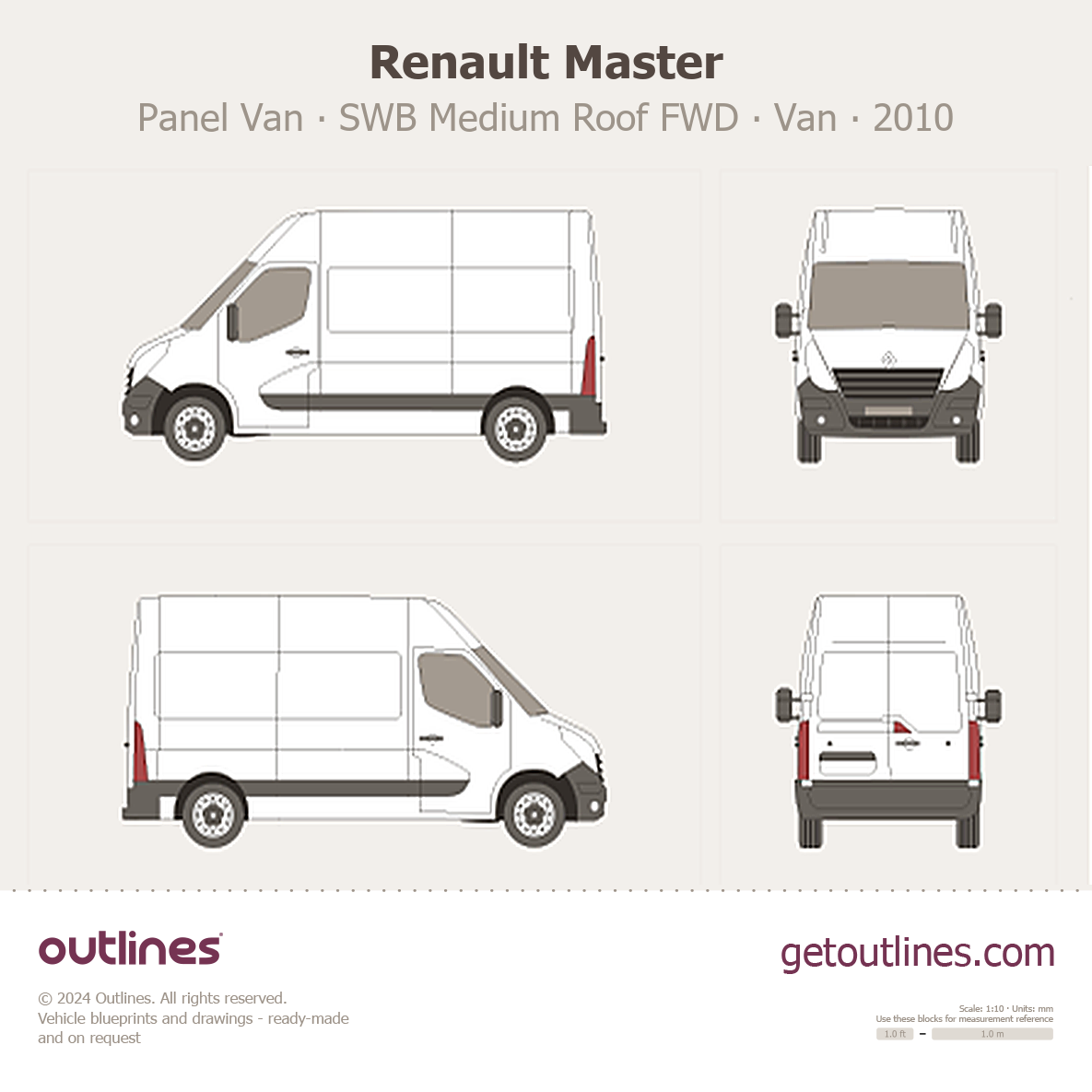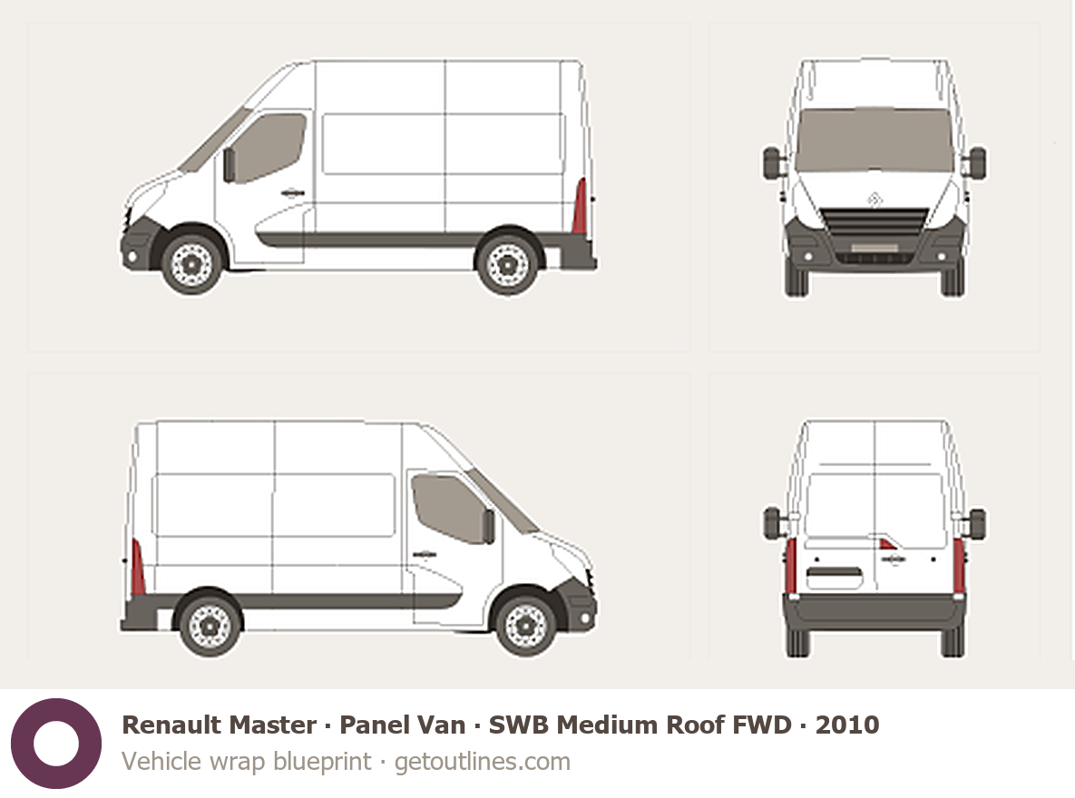 This 2010 Renault Master Panel Van SWB Medium Roof FWD Van blueprint helps designers, wrap studios, and 3D artists simplify their workflow and save valuable time for creative work instead of routine tasks.