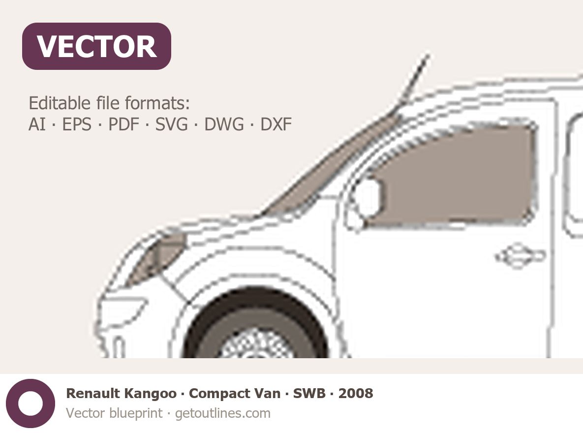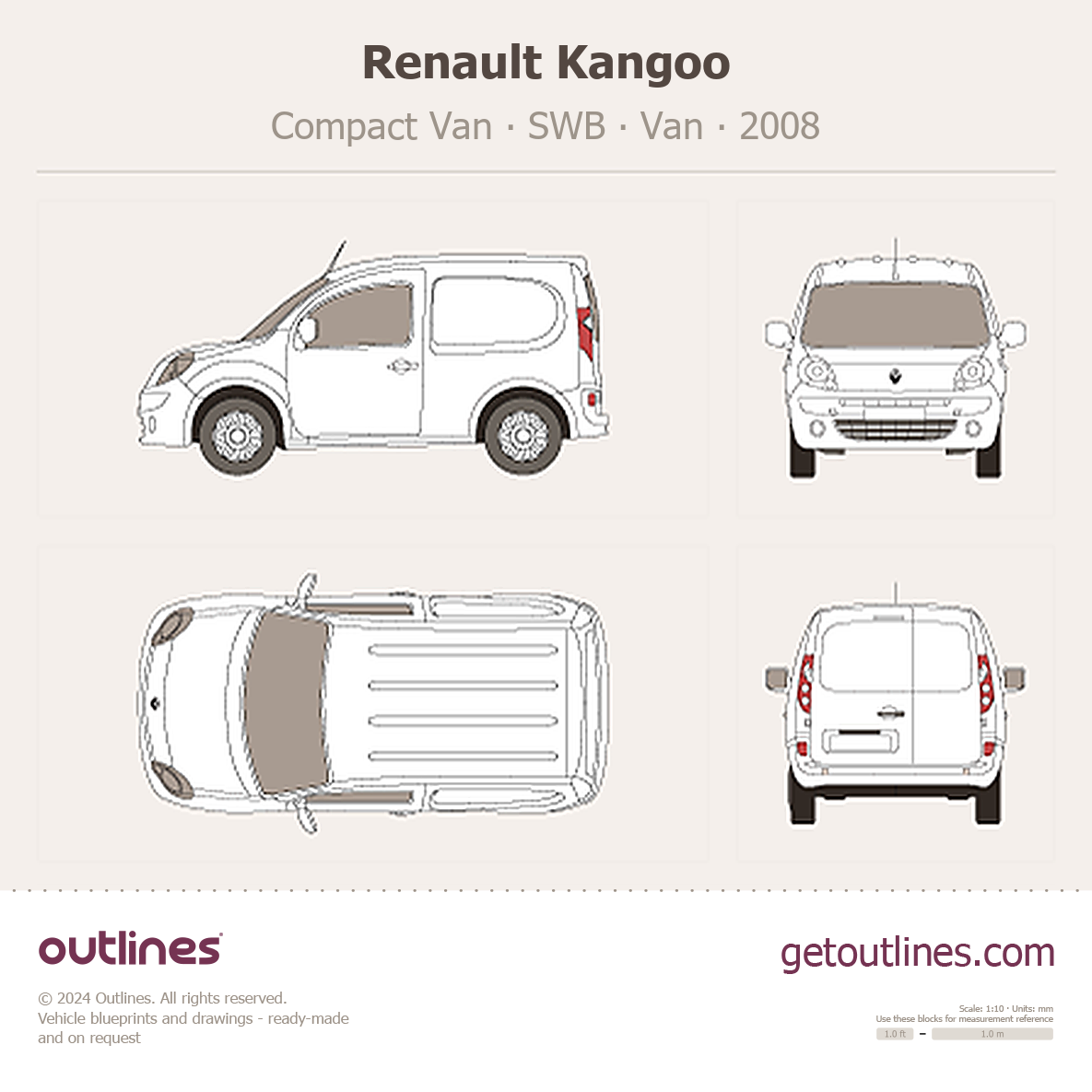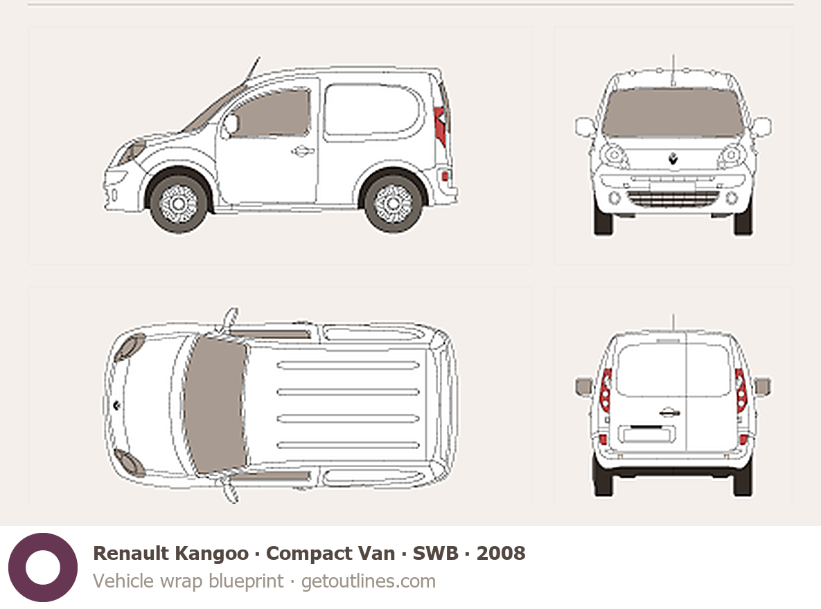 This 2008 Renault Kangoo Compact Van SWB Van blueprint helps designers, wrap studios, and 3D artists simplify their workflow and save valuable time for creative work instead of routine tasks.