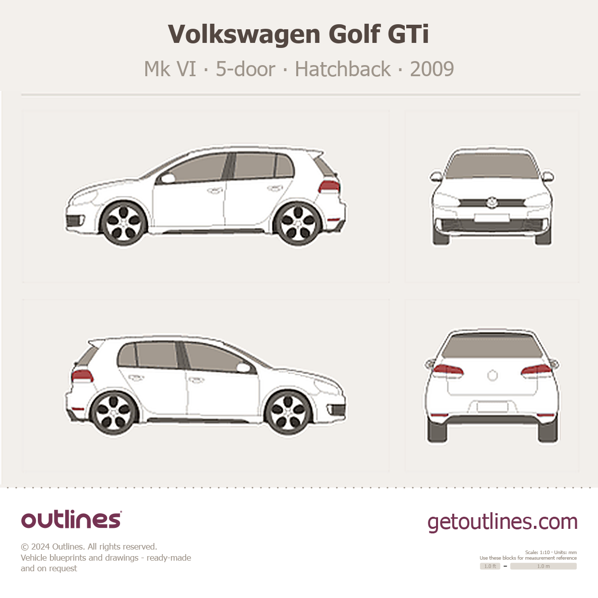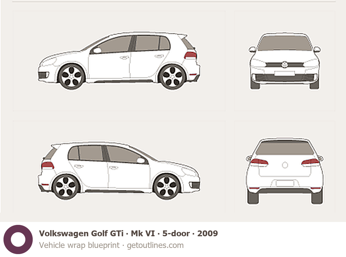 This 2009 Volkswagen Golf GTi Mk VI 5-door Hatchback blueprint helps designers, wrap studios, and 3D artists simplify their workflow and save valuable time for creative work instead of routine tasks.
