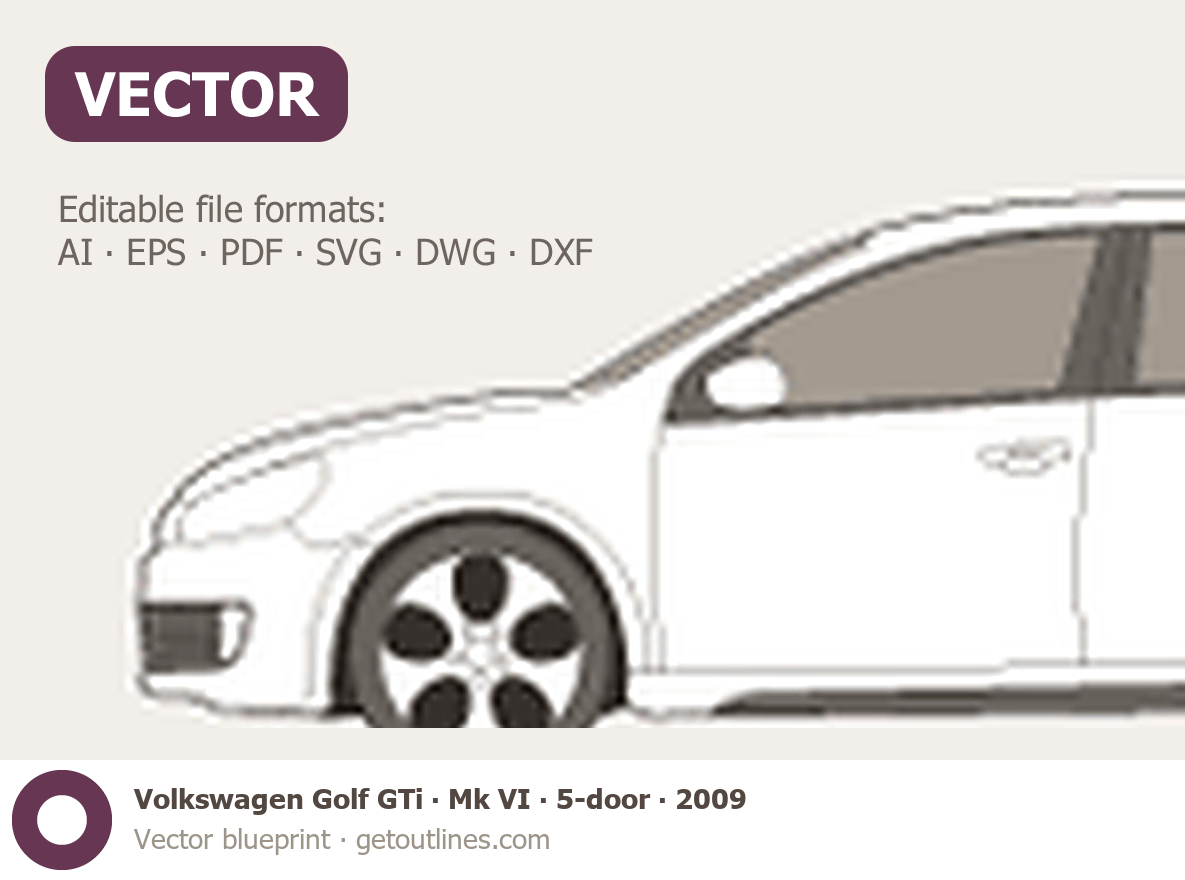 Buy this Volkswagen Golf GTi Mk VI blueprint and line drawing in high-quality editable vector file formats. Best for 3D and car wrap design.