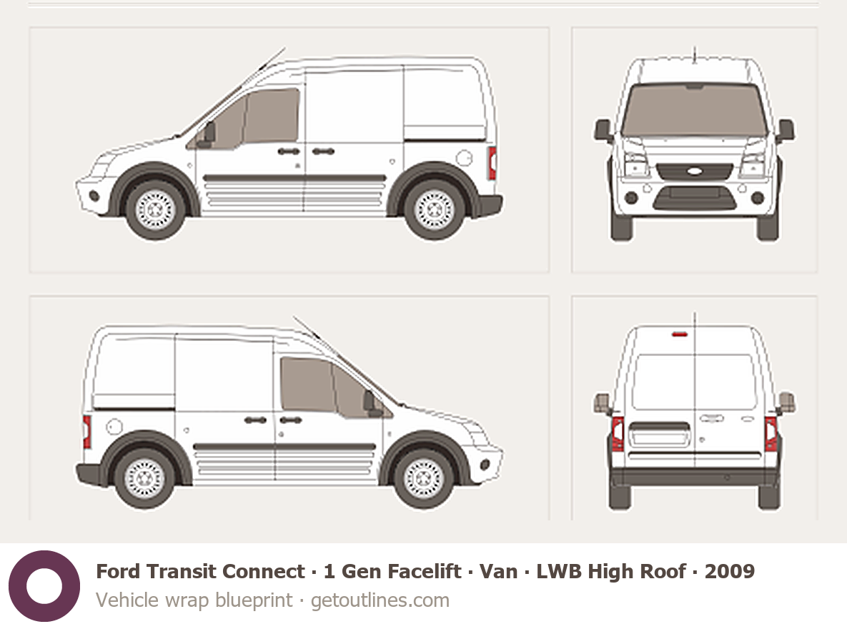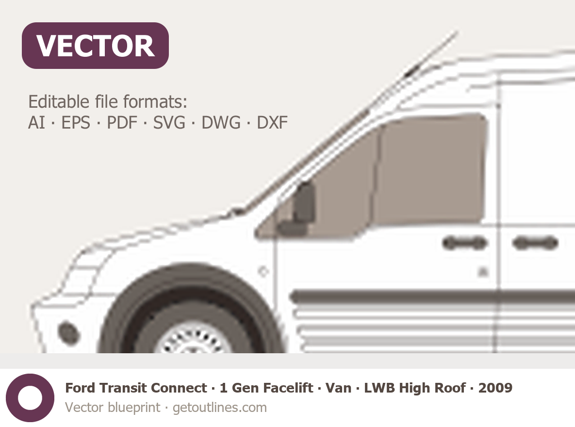 Buy this Ford Transit Connect 1 Gen Facelift ∙ Van blueprint and line drawing in high-quality editable vector file formats. Best for 3D and car wrap design.