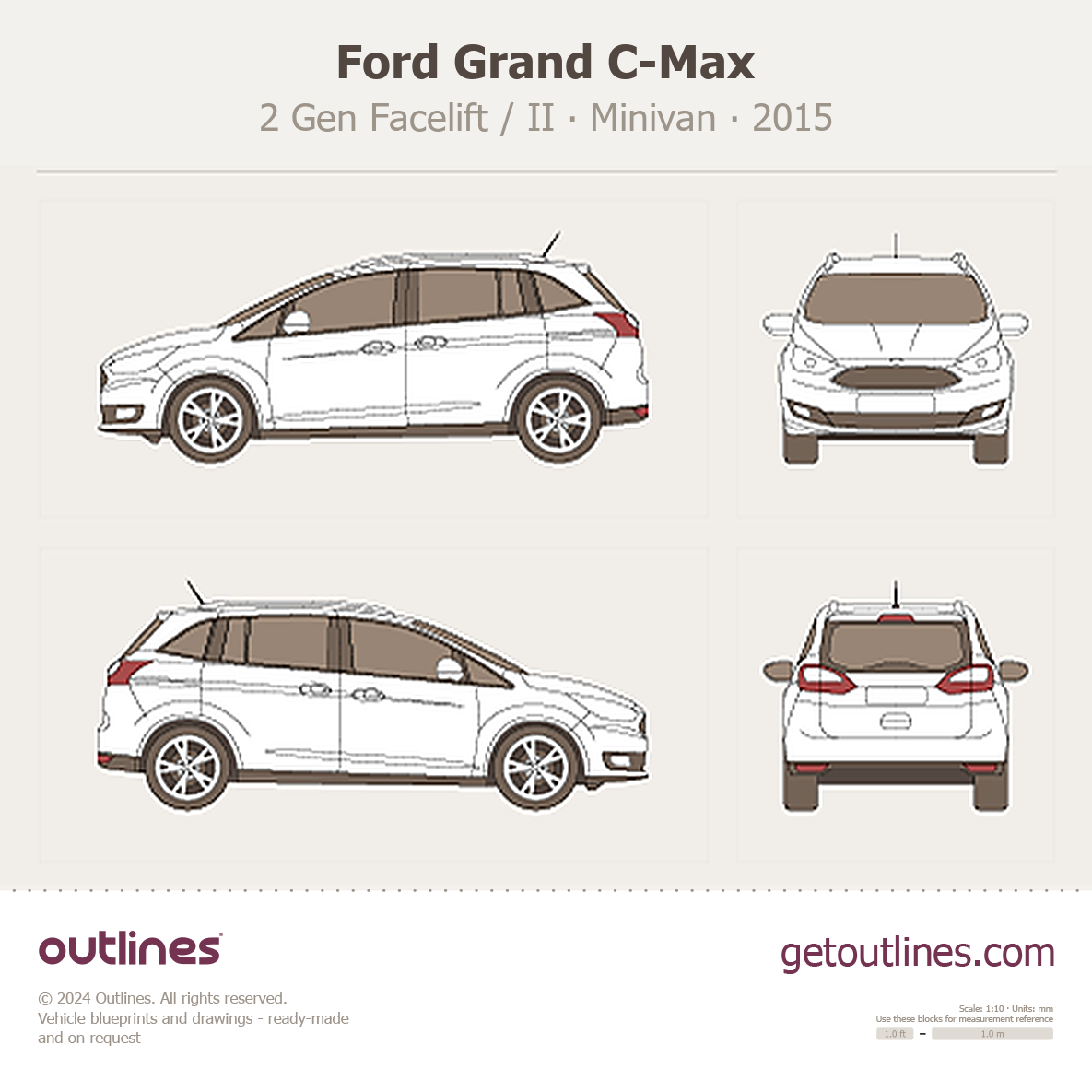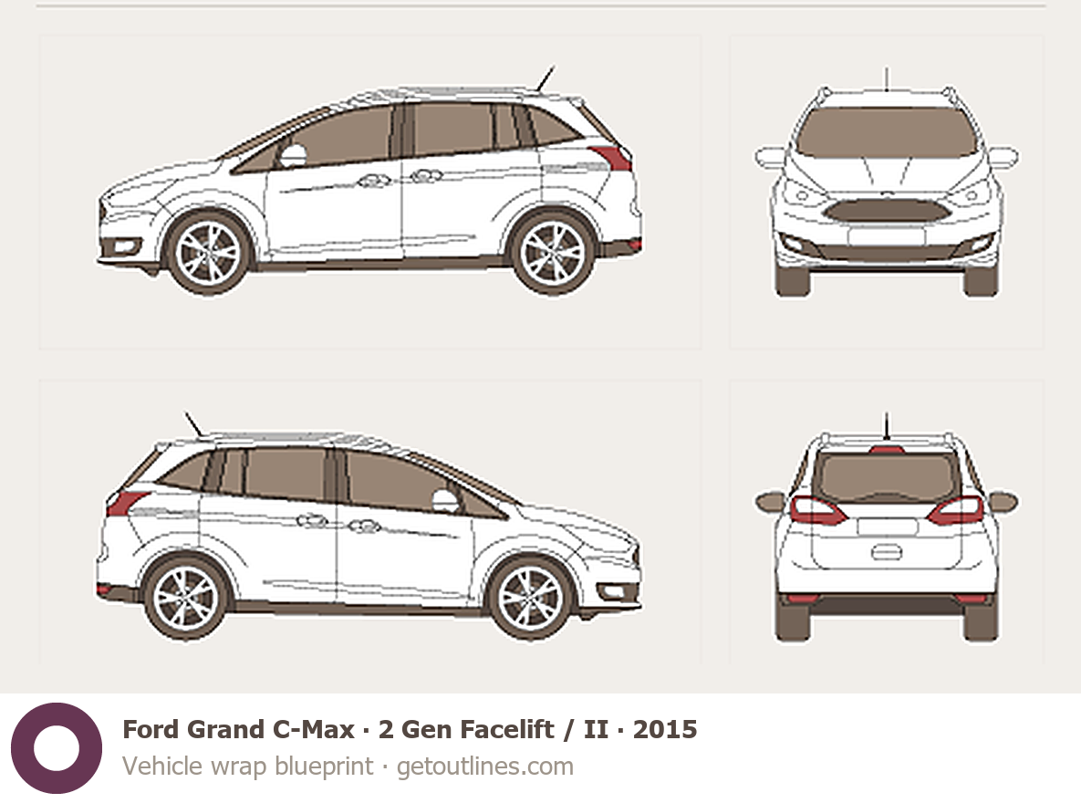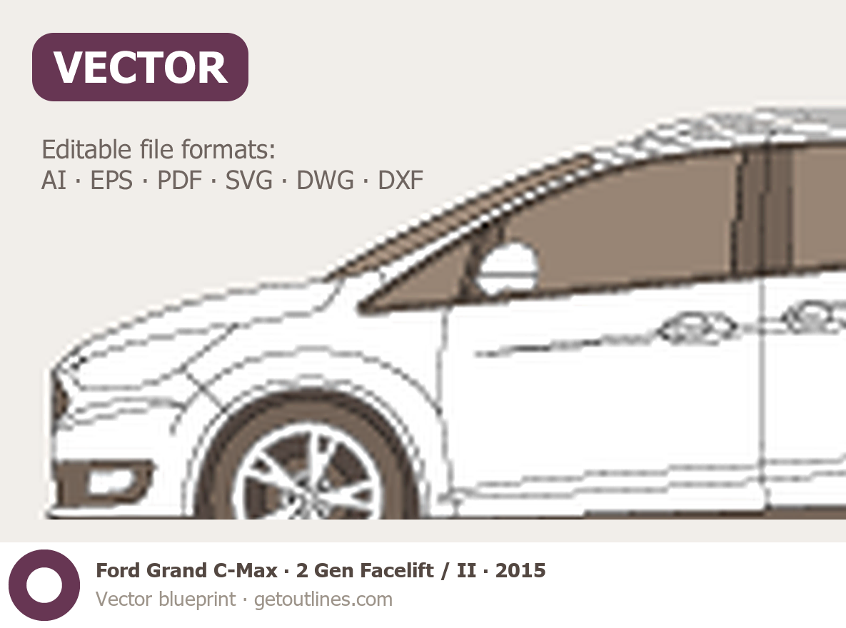 Buy this Ford Grand C-Max 2 Gen Facelift / II blueprint and line drawing in high-quality editable vector file formats. Best for 3D and car wrap design.