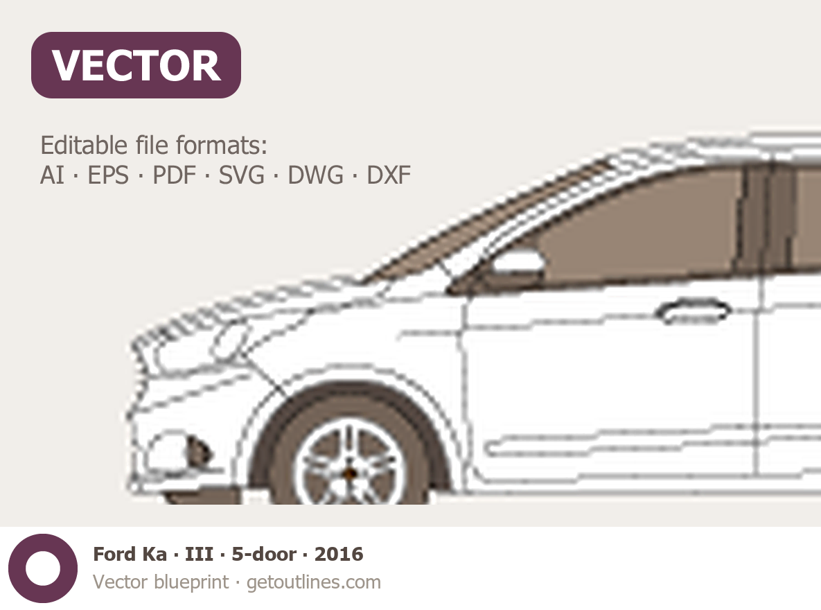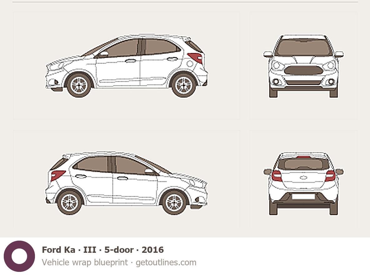 This 2016 Ford Ka III 5-door Hatchback blueprint helps designers, wrap studios, and 3D artists simplify their workflow and save valuable time for creative work instead of routine tasks.
