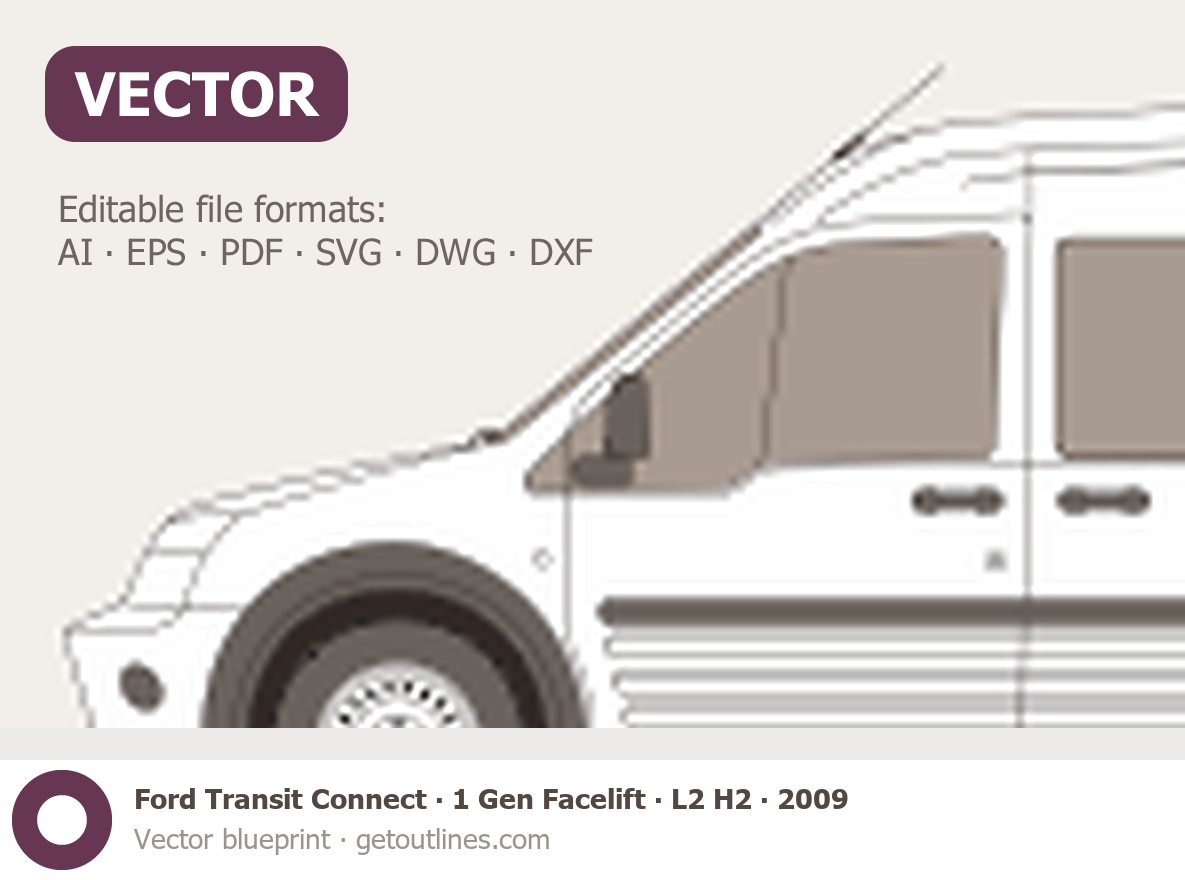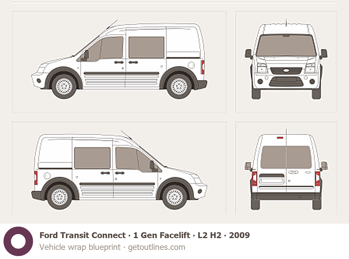 This 2009 Ford Transit Connect 1 Gen Facelift L2 H2 Van blueprint helps designers, wrap studios, and 3D artists simplify their workflow and save valuable time for creative work instead of routine tasks.