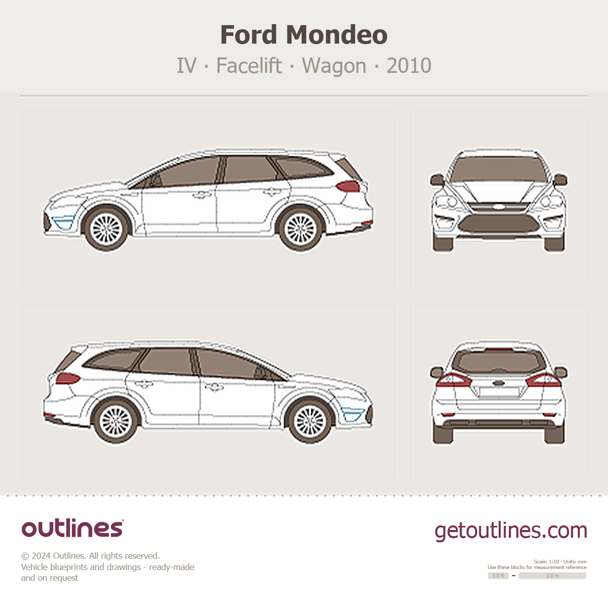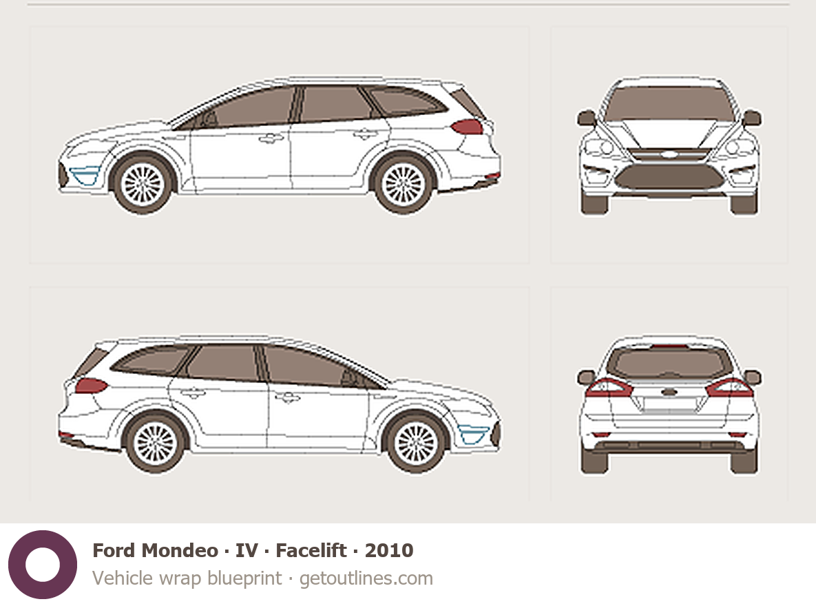 This 2010 Ford Mondeo IV Facelift Wagon blueprint helps designers, wrap studios, and 3D artists simplify their workflow and save valuable time for creative work instead of routine tasks.