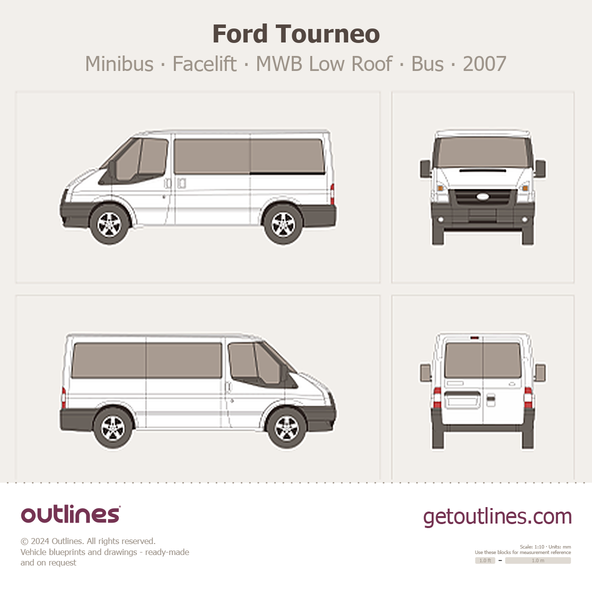 This 2007 Ford Tourneo Minibus ∙ Facelift MWB Low Roof Bus blueprint helps designers, wrap studios, and 3D artists simplify their workflow and save valuable time for creative work instead of routine tasks.
