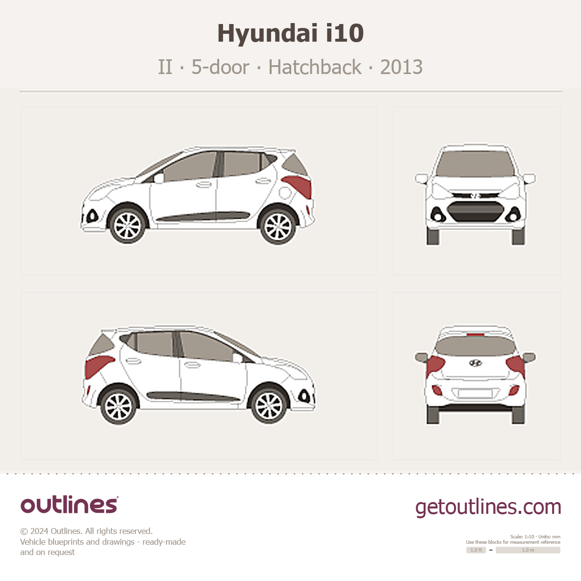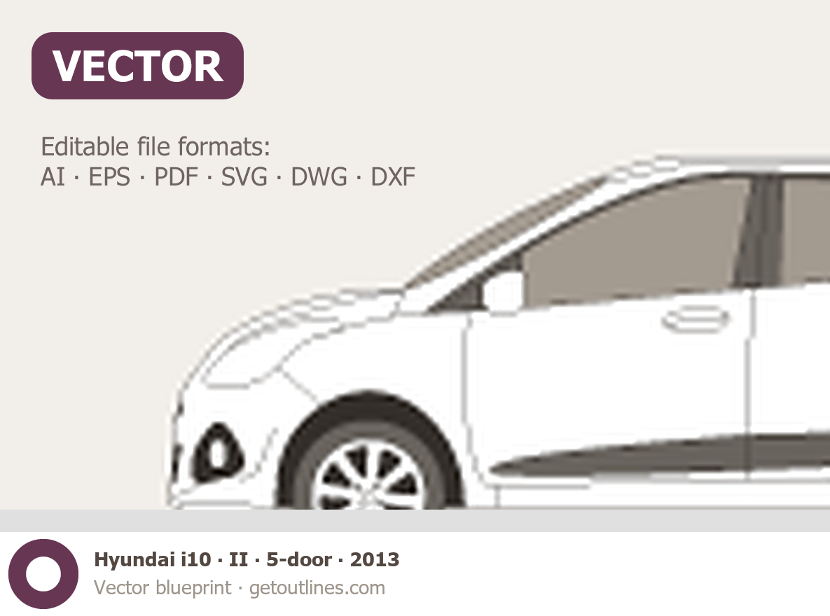 Buy this Hyundai i10 II blueprint and line drawing in high-quality editable vector file formats. Best for 3D and car wrap design.