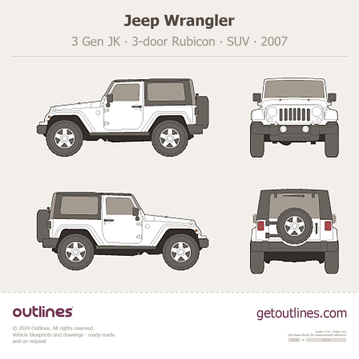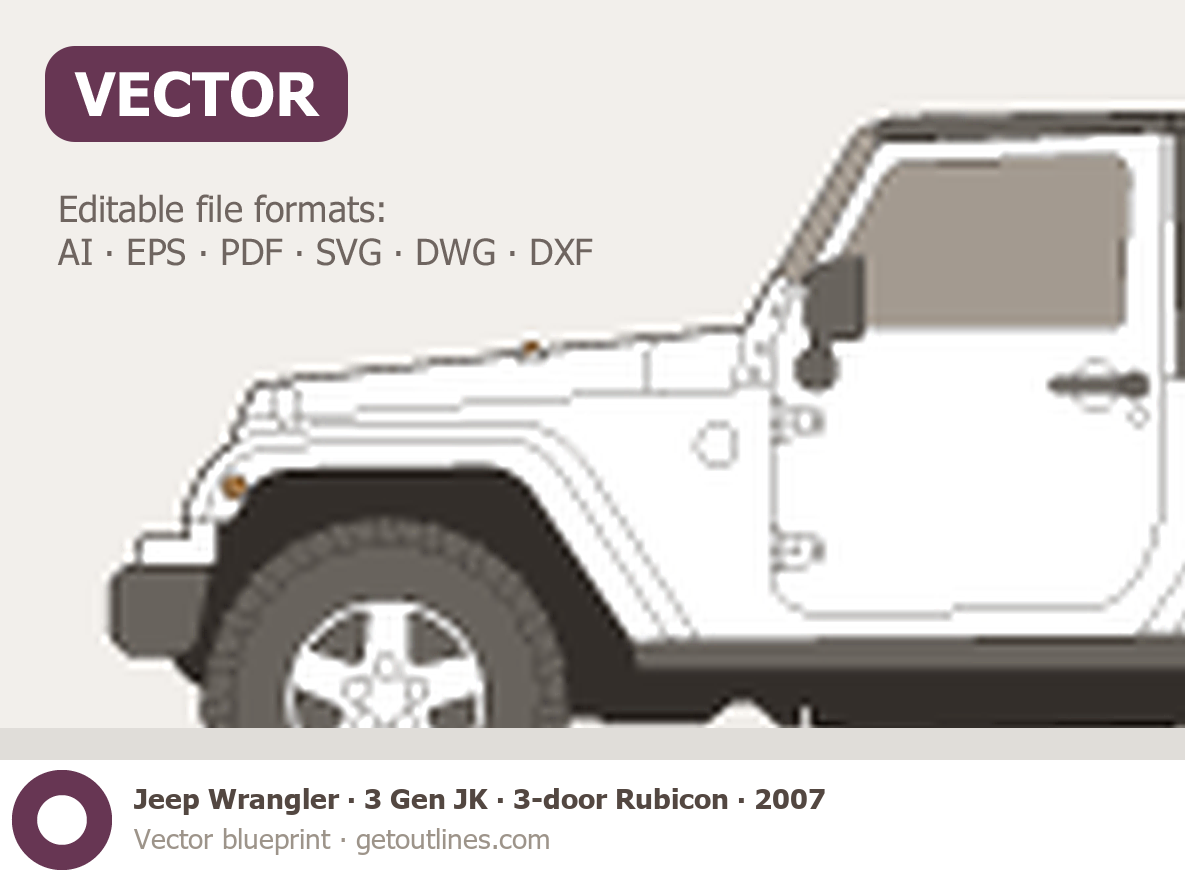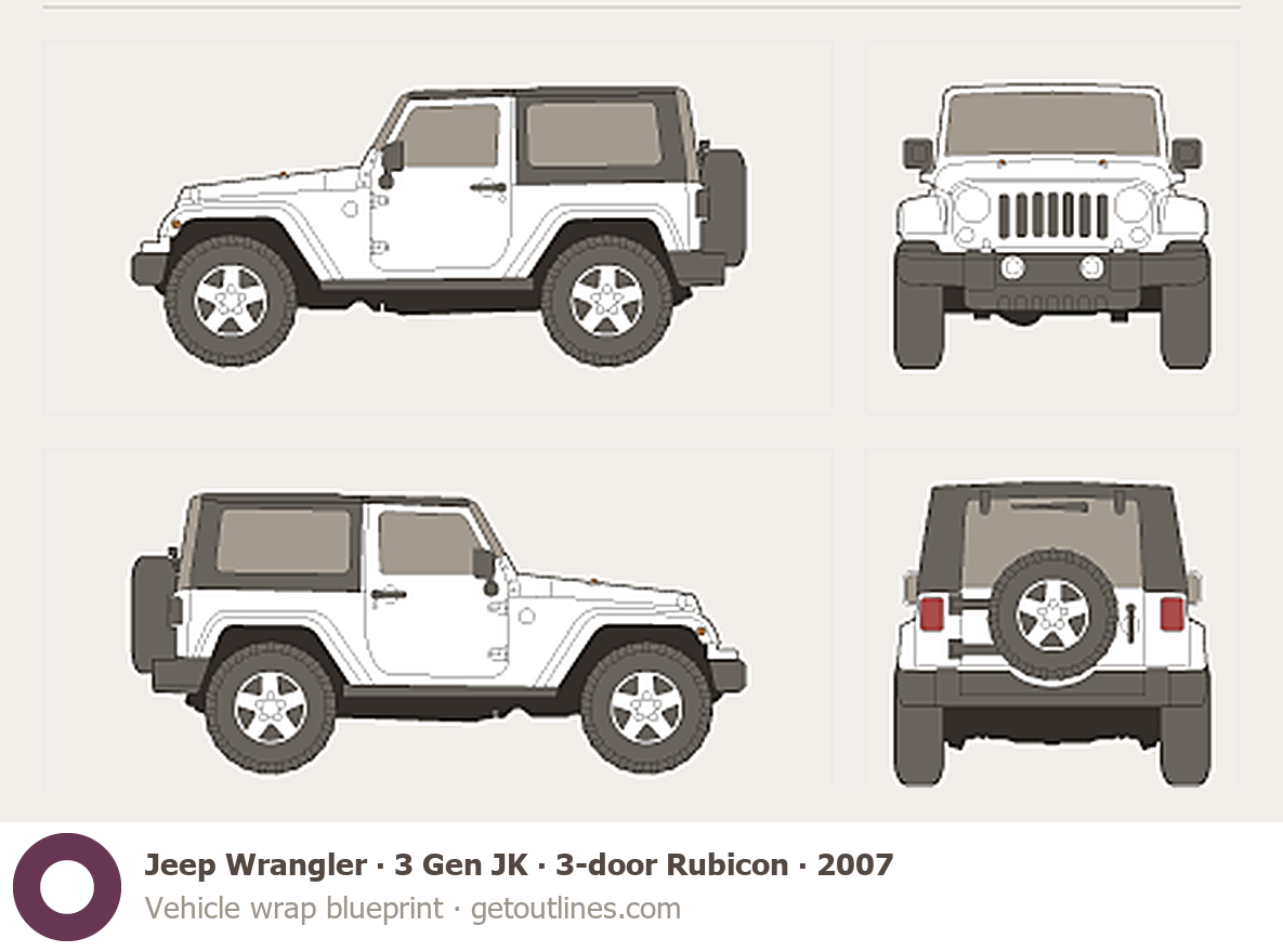 This 2007 Jeep Wrangler 3 Gen JK 3-door Rubicon SUV blueprint helps designers, wrap studios, and 3D artists simplify their workflow and save valuable time for creative work instead of routine tasks.