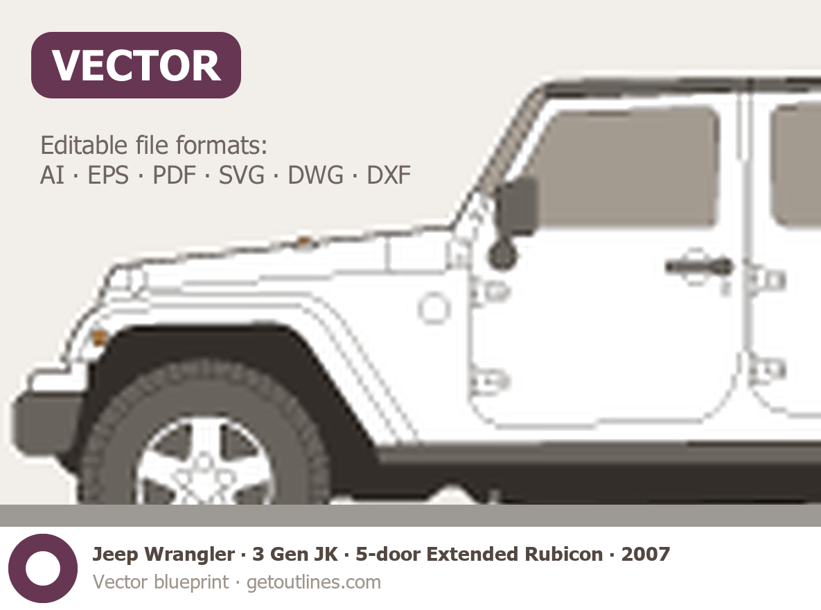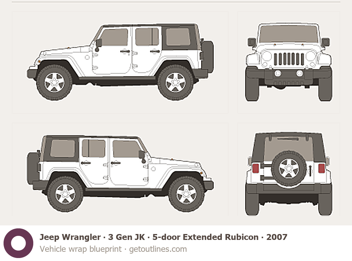 This 2007 Jeep Wrangler 3 Gen JK 5-door Extended Rubicon SUV blueprint helps designers, wrap studios, and 3D artists simplify their workflow and save valuable time for creative work instead of routine tasks.
