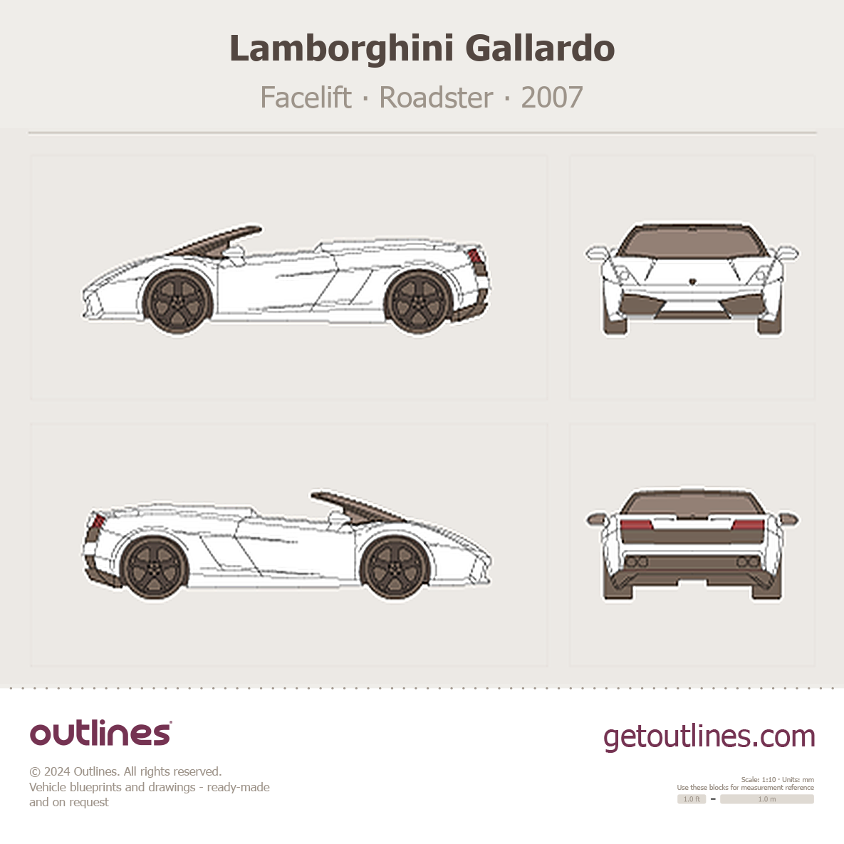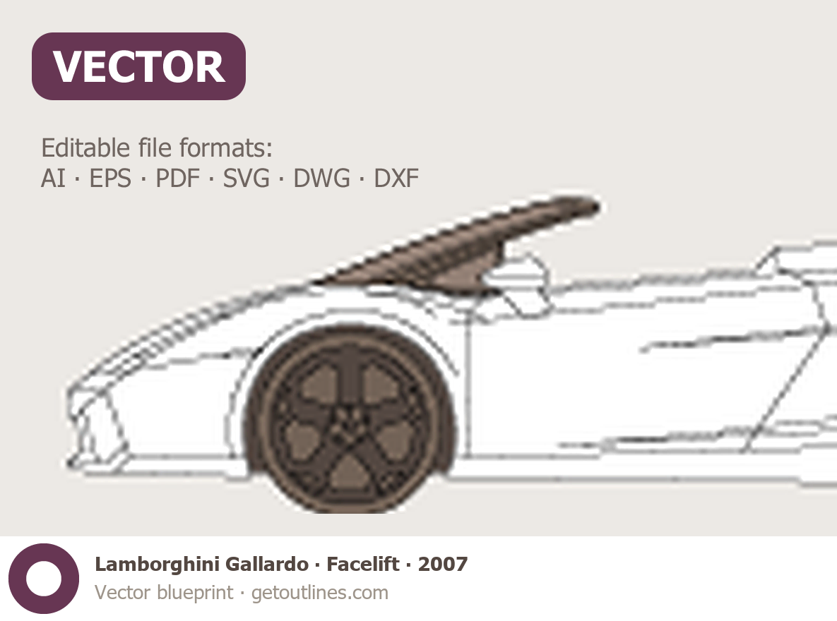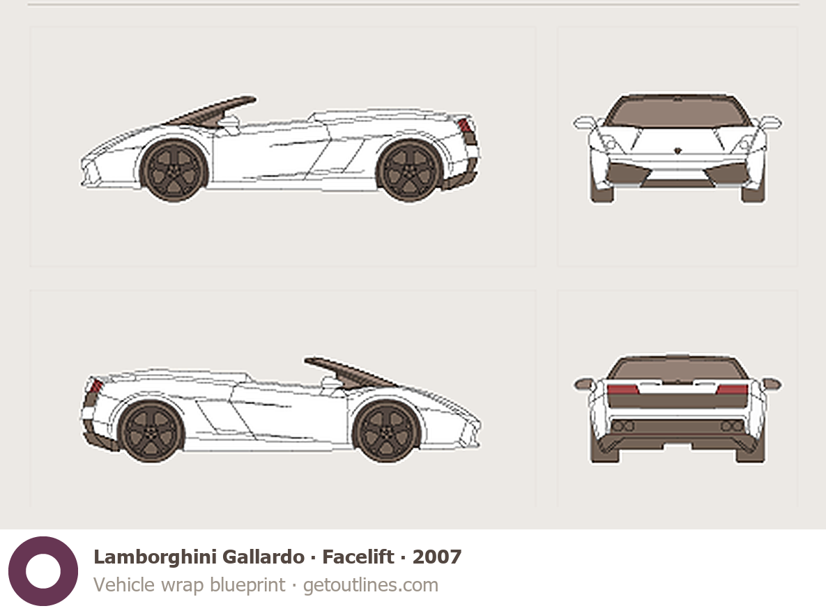 This 2007 Lamborghini Gallardo Facelift Roadster blueprint helps designers, wrap studios, and 3D artists simplify their workflow and save valuable time for creative work instead of routine tasks.