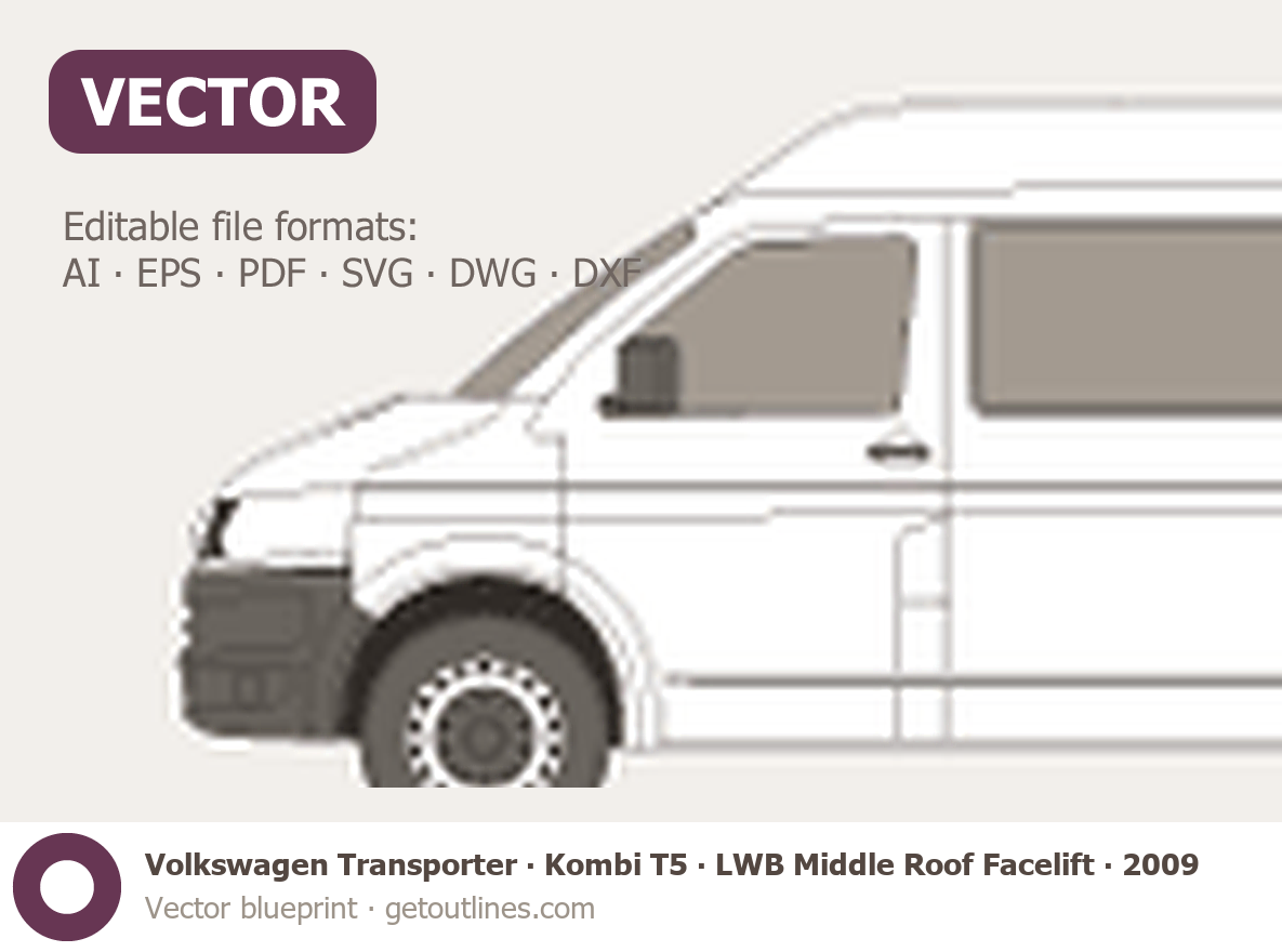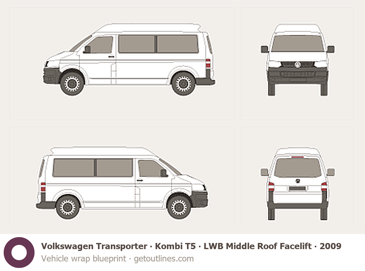 This 2009 Volkswagen Transporter Kombi T5 LWB Middle Roof Facelift Minivan blueprint helps designers, wrap studios, and 3D artists simplify their workflow and save valuable time for creative work instead of routine tasks.