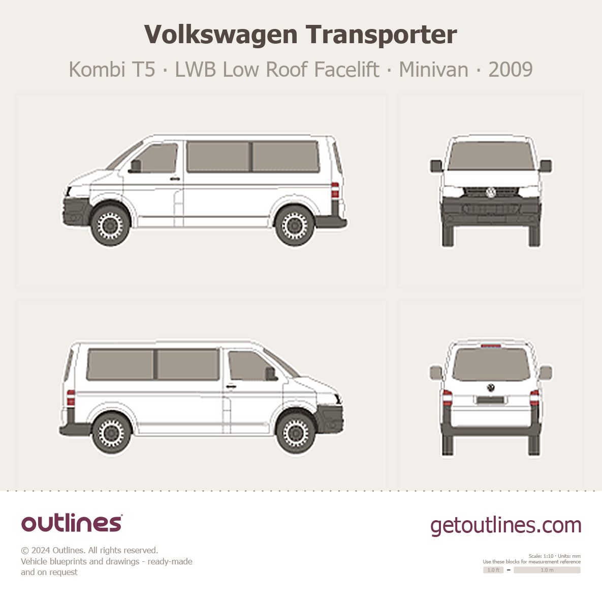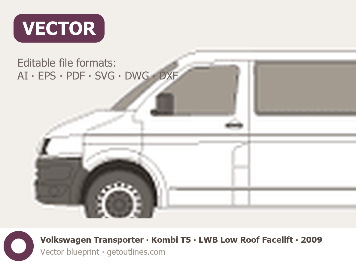 This 2009 Volkswagen Transporter Kombi T5 LWB Low Roof Facelift Minivan blueprint helps designers, wrap studios, and 3D artists simplify their workflow and save valuable time for creative work instead of routine tasks.