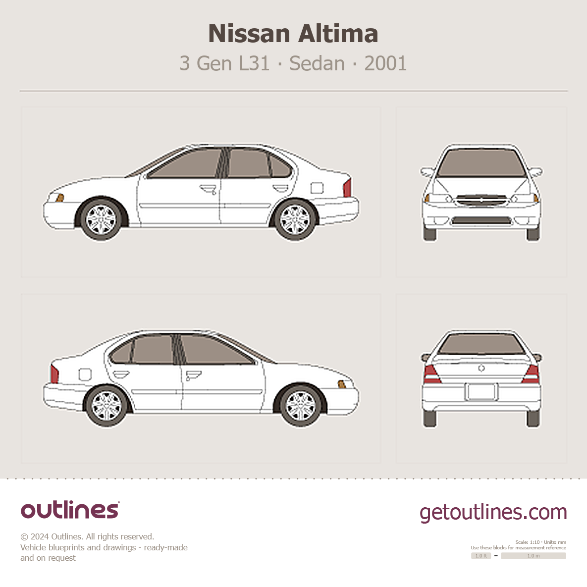 This is a blueprint of the Altima, produced by carmaker Nissan in 2001 - 2006. It features a Sedan body design and is classified as a Family vehicle.