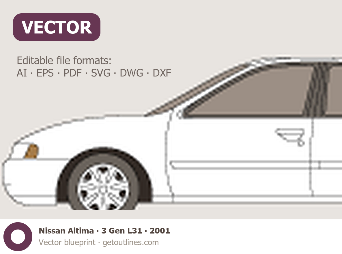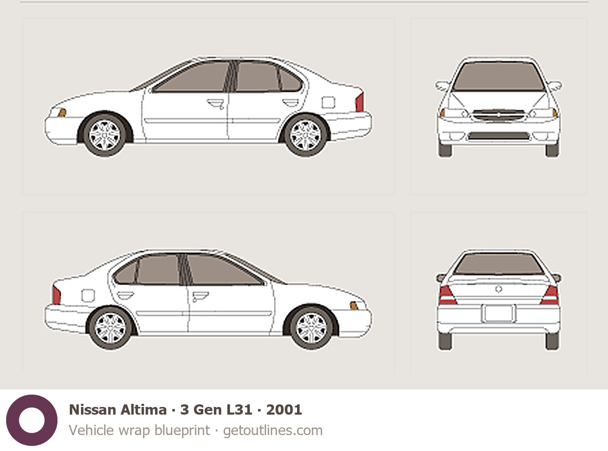 This 2001 Nissan Altima 3 Gen L31 Sedan blueprint helps designers, wrap studios, and 3D artists simplify their workflow and save valuable time for creative work instead of routine tasks.