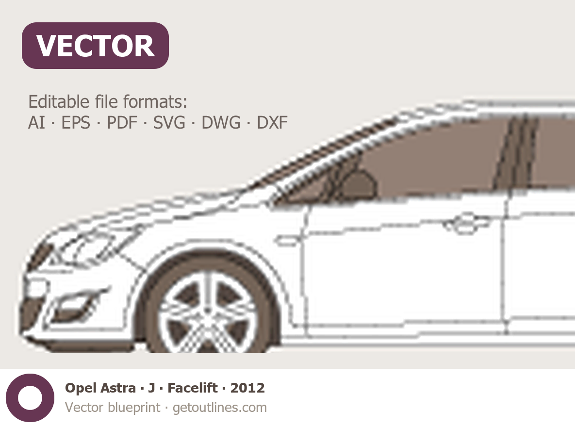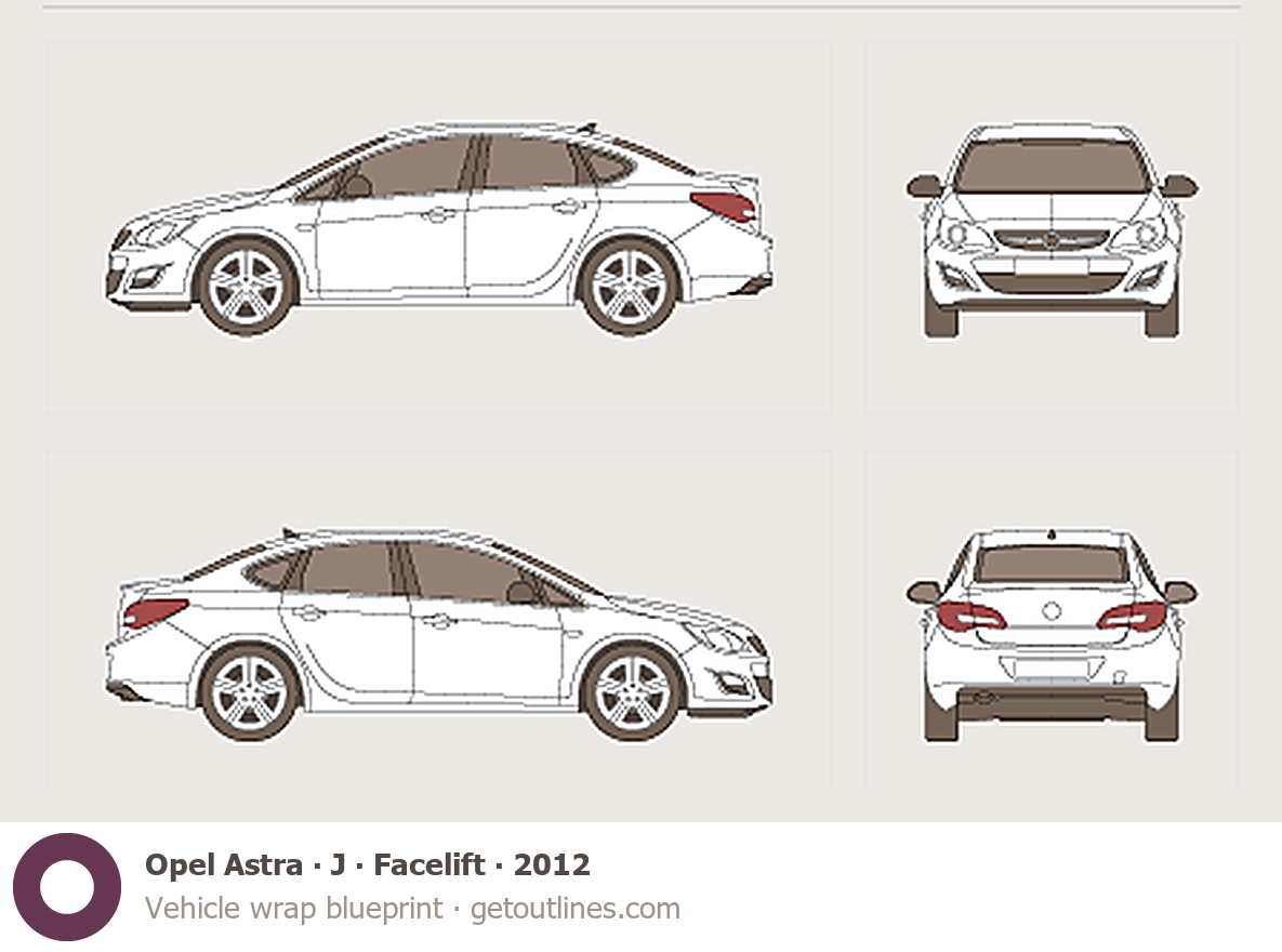 This 2012 Opel Astra J Facelift Sedan blueprint helps designers, wrap studios, and 3D artists simplify their workflow and save valuable time for creative work instead of routine tasks.