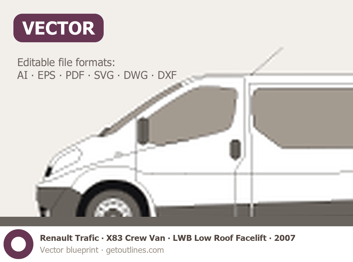 This 2007 Renault Trafic X83 Crew Van LWB Low Roof Facelift Van blueprint helps designers, wrap studios, and 3D artists simplify their workflow and save valuable time for creative work instead of routine tasks.