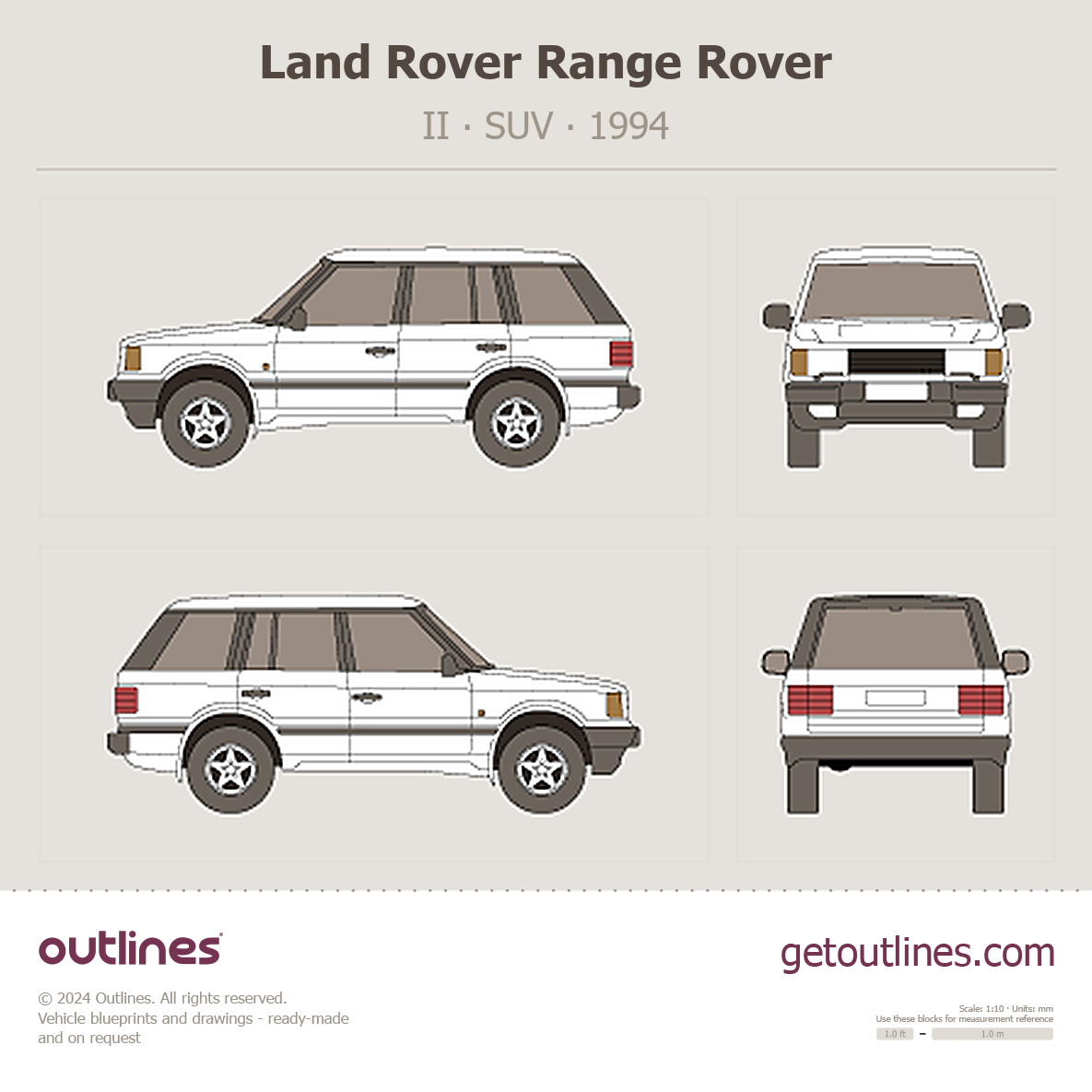 This is a blueprint of the Range Rover, produced by carmaker Land Rover in 1994 - 2002. It features a SUV body design and is classified as a Luxury vehicle.