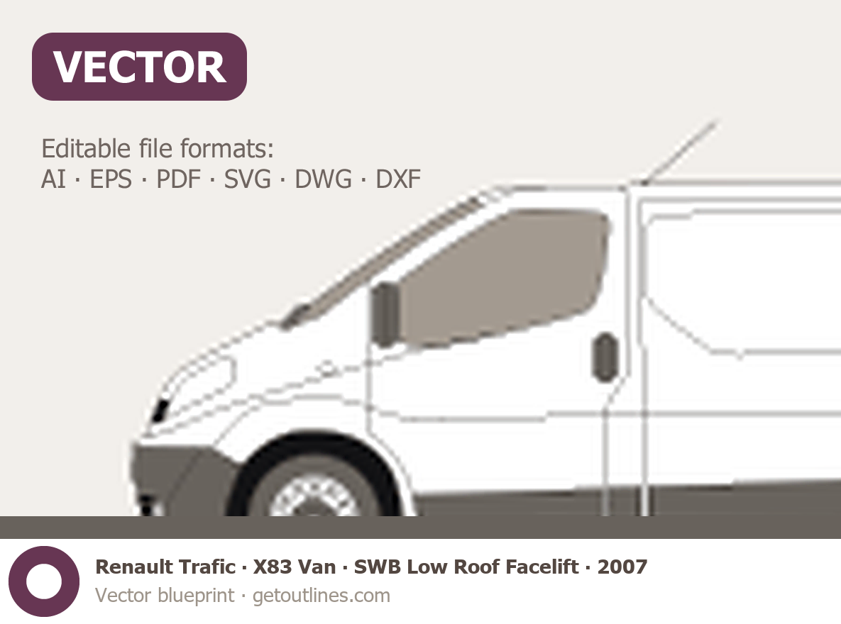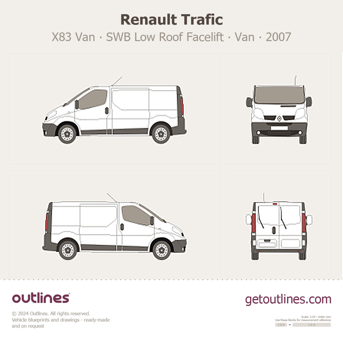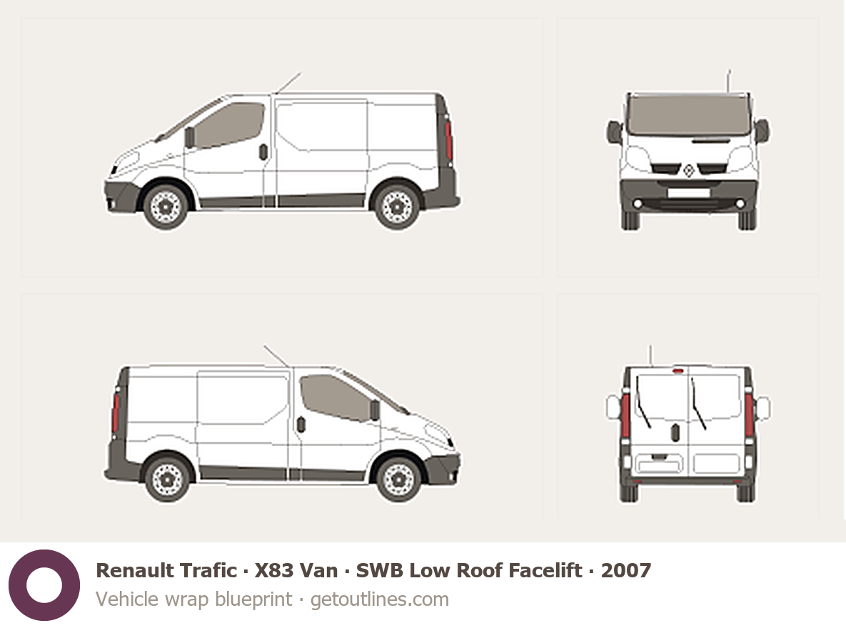 This 2007 Renault Trafic X83 Van SWB Low Roof Facelift Van blueprint helps designers, wrap studios, and 3D artists simplify their workflow and save valuable time for creative work instead of routine tasks.