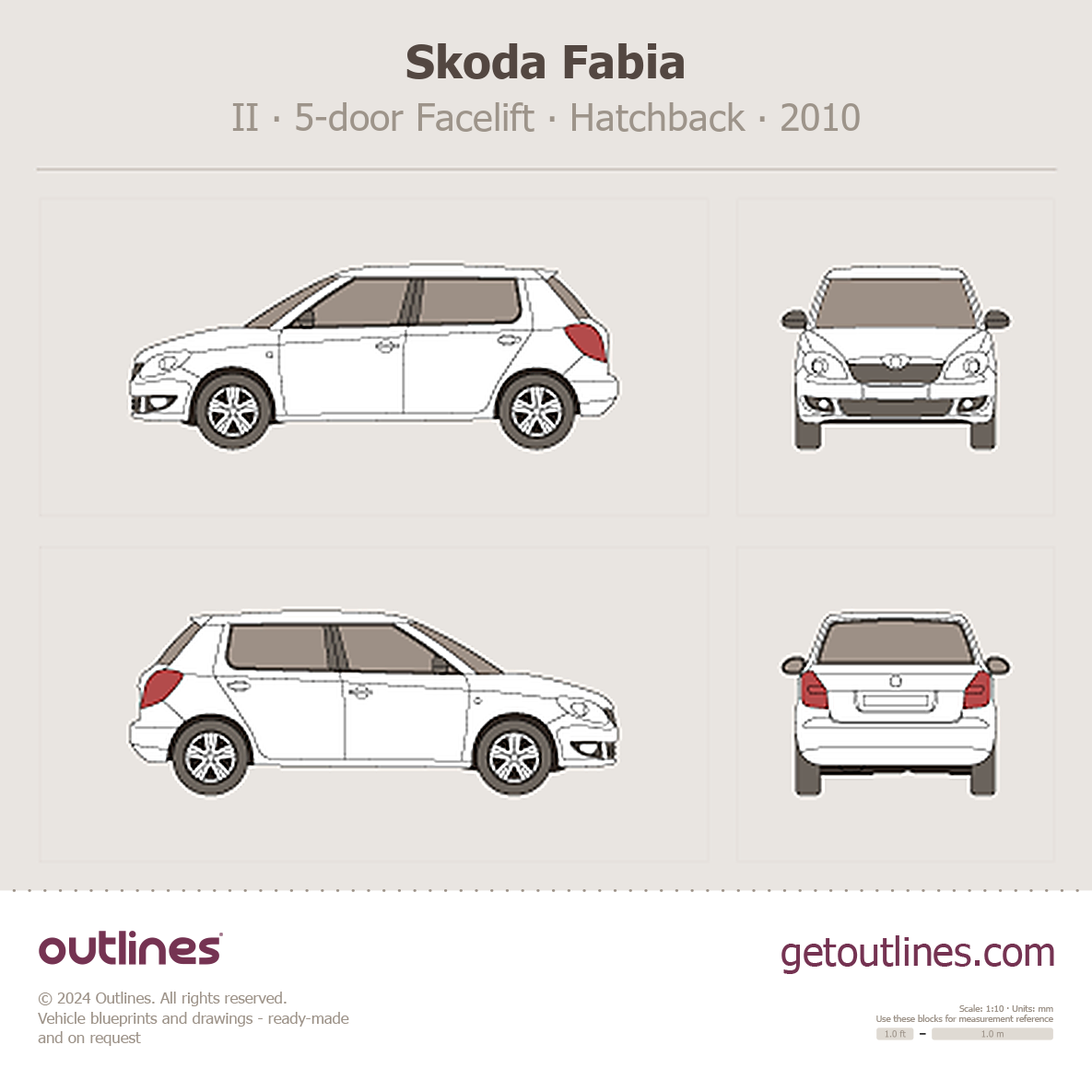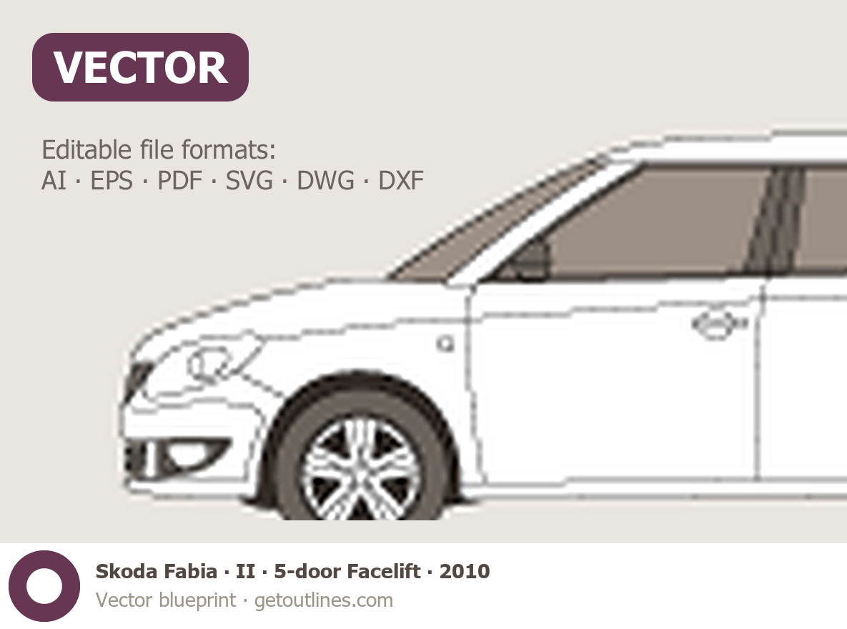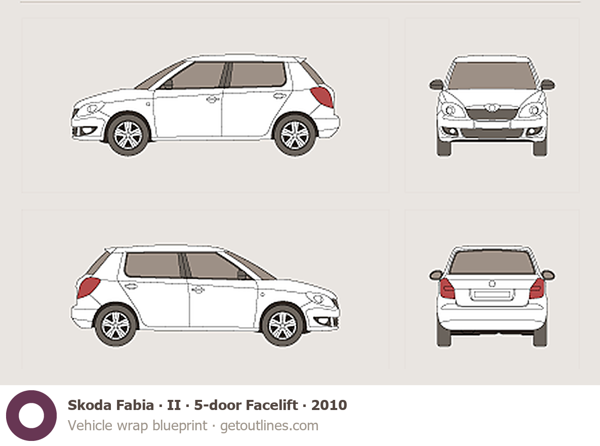 This 2010 Skoda Fabia II 5-door Facelift Hatchback blueprint helps designers, wrap studios, and 3D artists simplify their workflow and save valuable time for creative work instead of routine tasks.