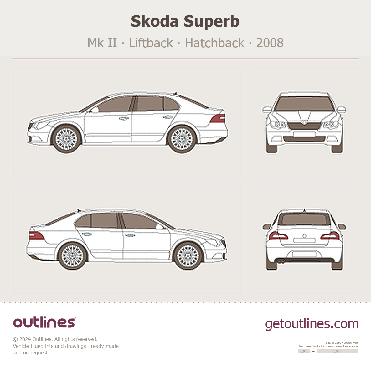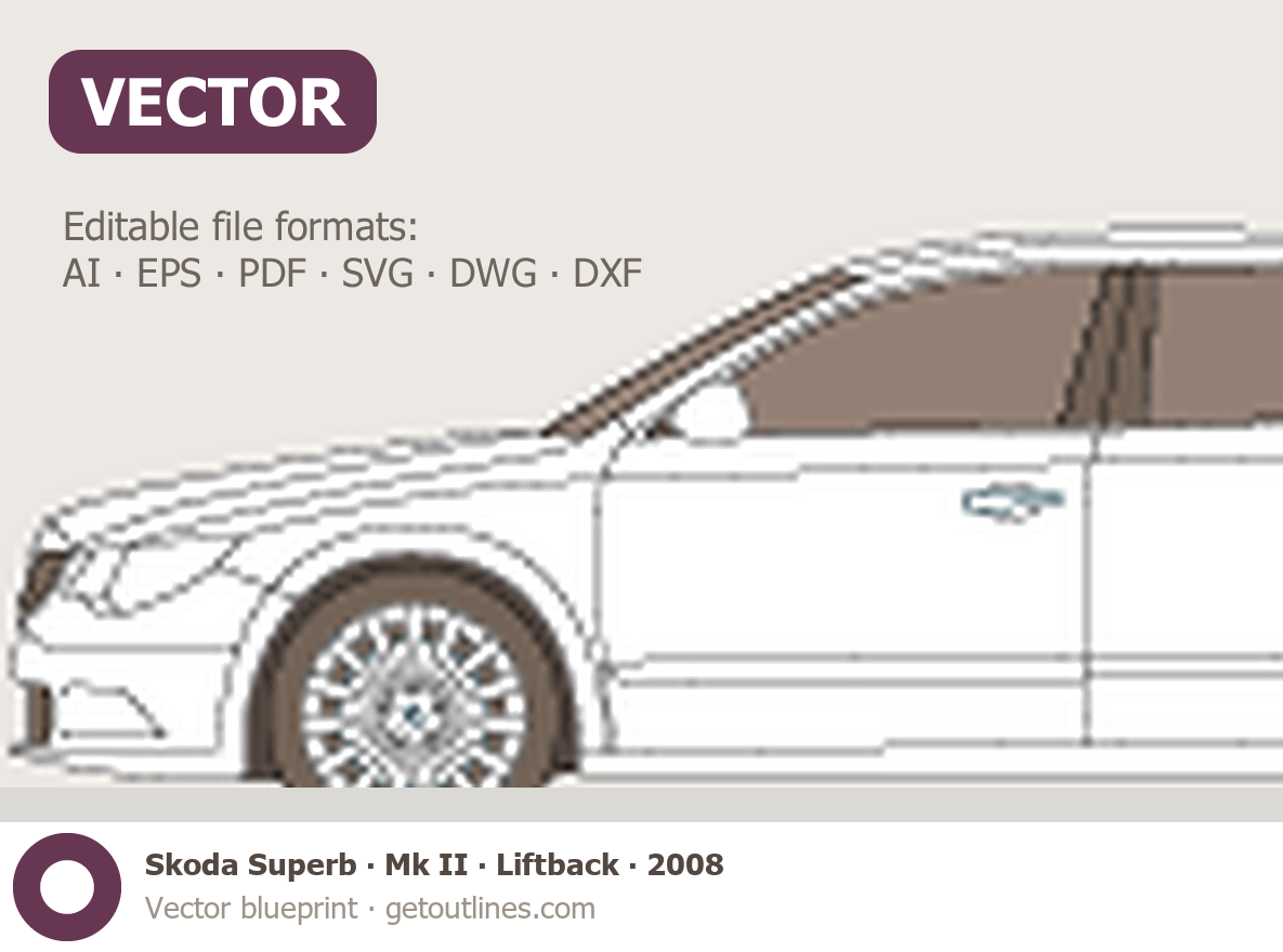 This 2008 Skoda Superb Mk II Liftback Hatchback blueprint helps designers, wrap studios, and 3D artists simplify their workflow and save valuable time for creative work instead of routine tasks.