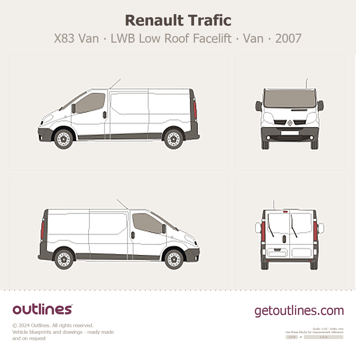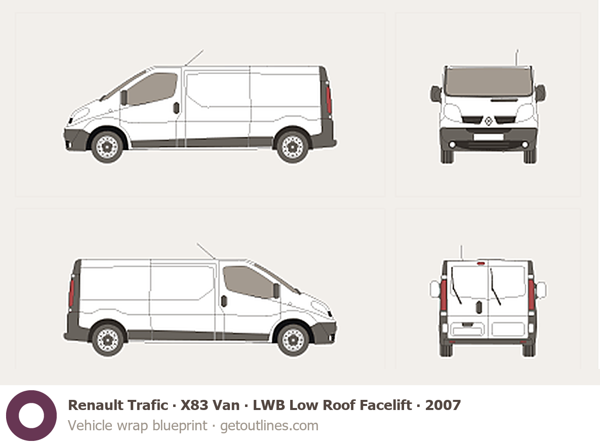 This 2007 Renault Trafic X83 Van LWB Low Roof Facelift Van blueprint helps designers, wrap studios, and 3D artists simplify their workflow and save valuable time for creative work instead of routine tasks.