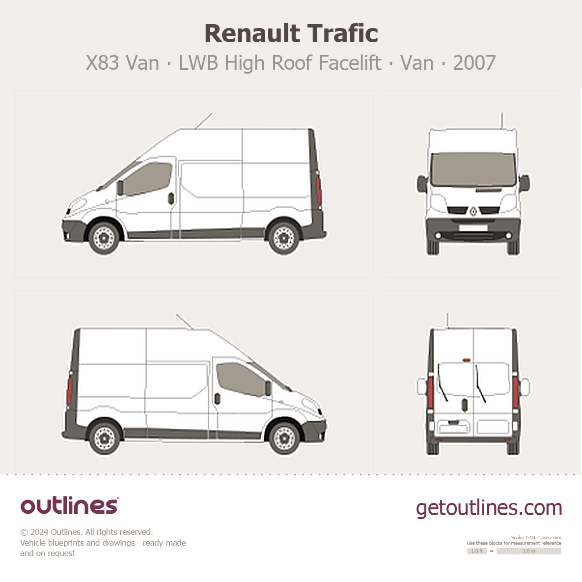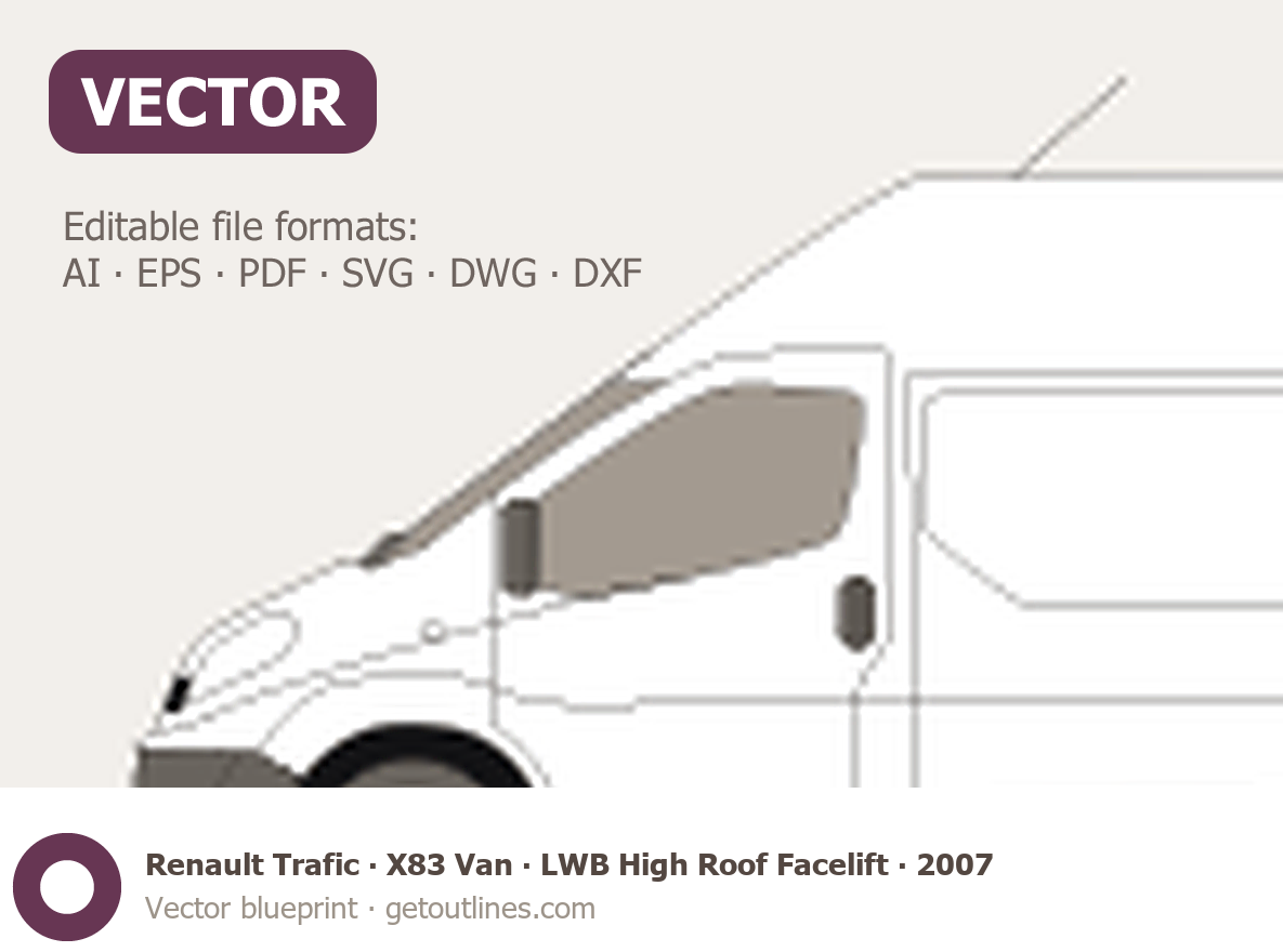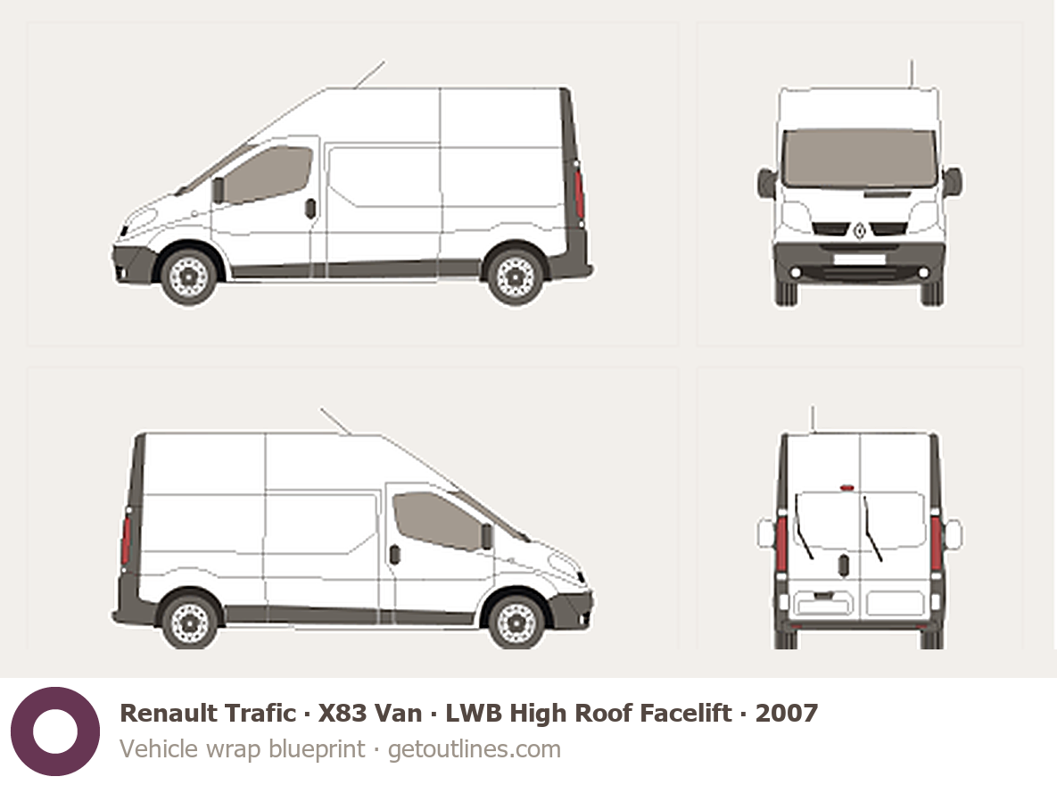 This 2007 Renault Trafic X83 Van LWB High Roof Facelift Van blueprint helps designers, wrap studios, and 3D artists simplify their workflow and save valuable time for creative work instead of routine tasks.