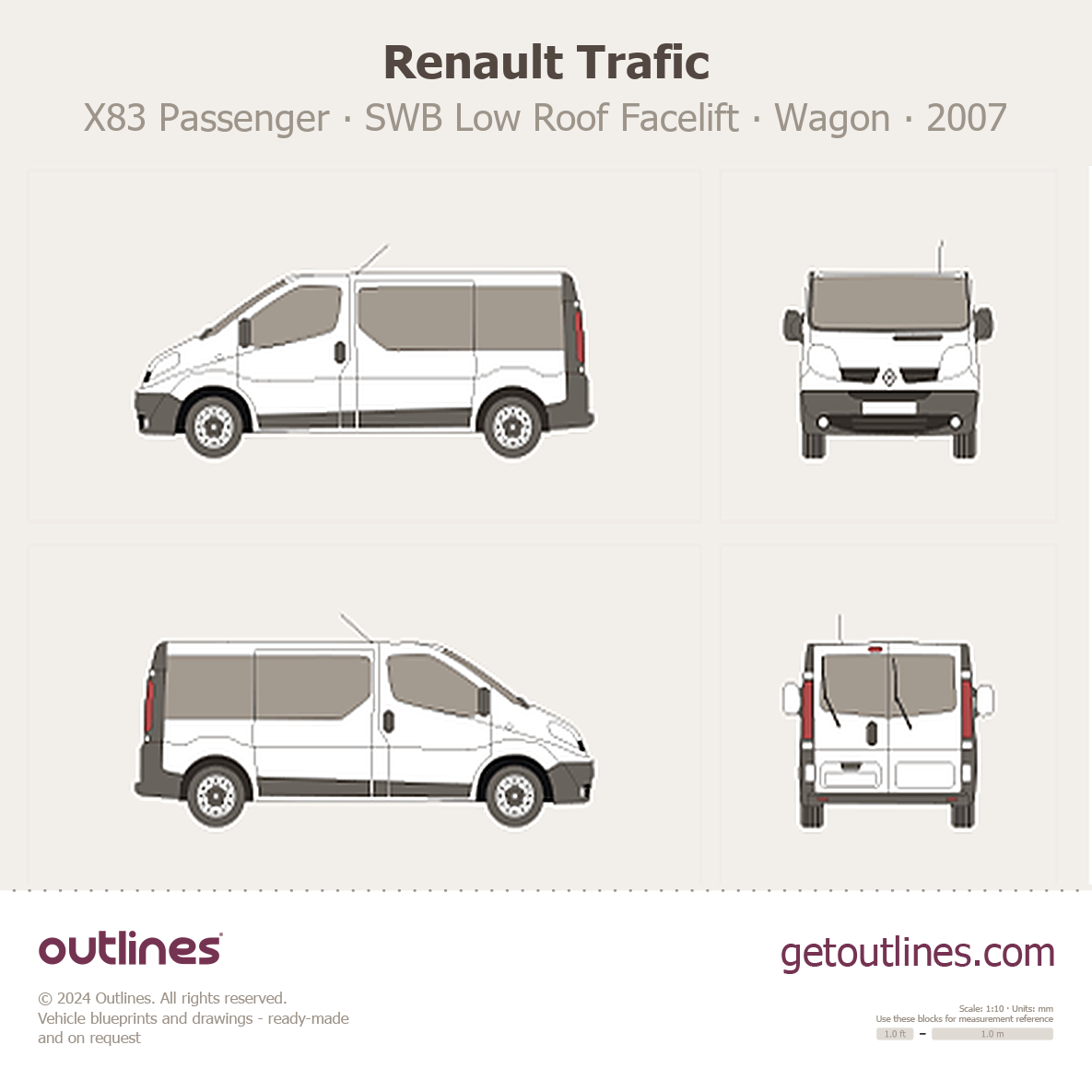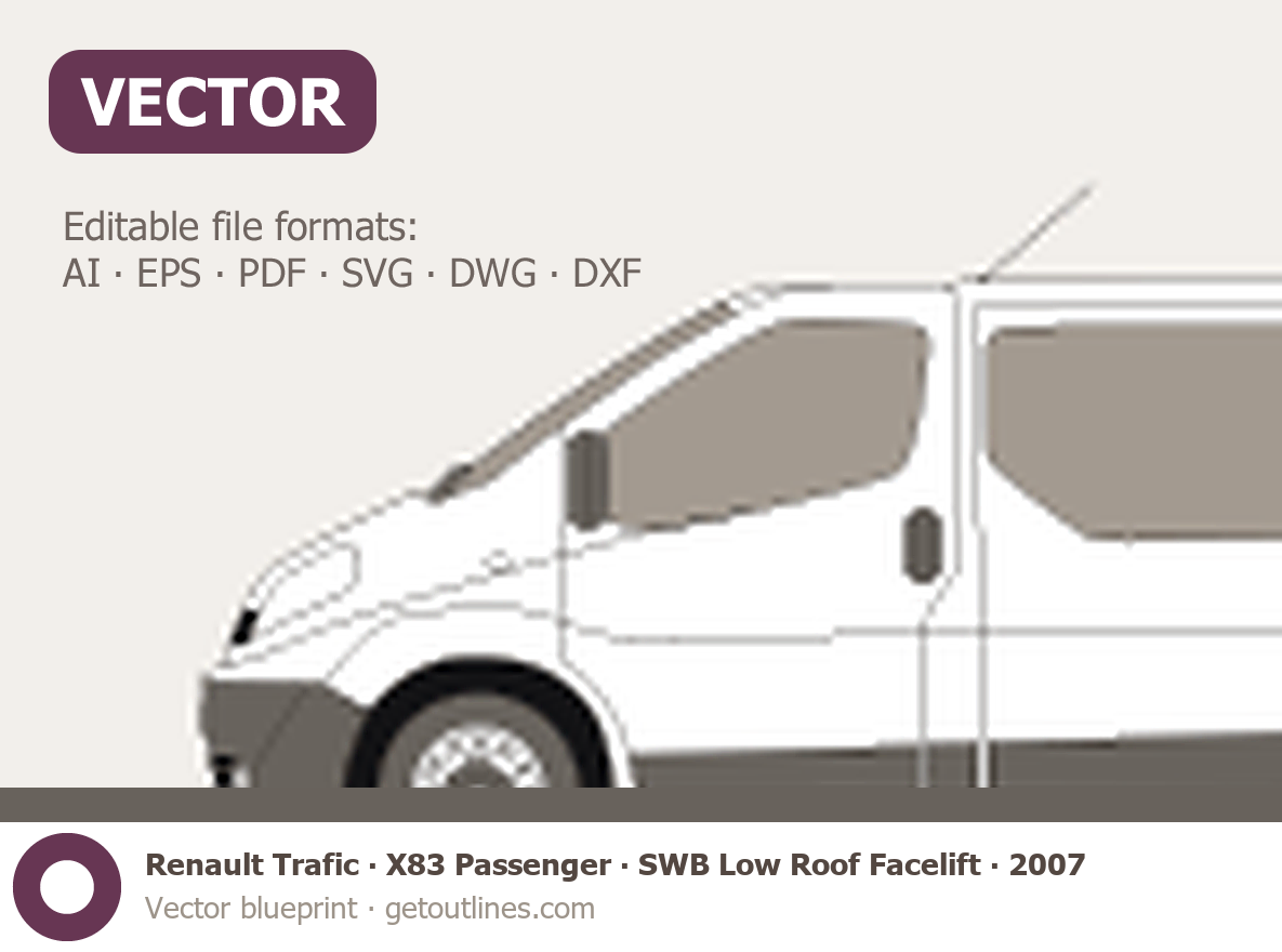 This 2007 Renault Trafic X83 Passenger SWB Low Roof Facelift Wagon blueprint helps designers, wrap studios, and 3D artists simplify their workflow and save valuable time for creative work instead of routine tasks.