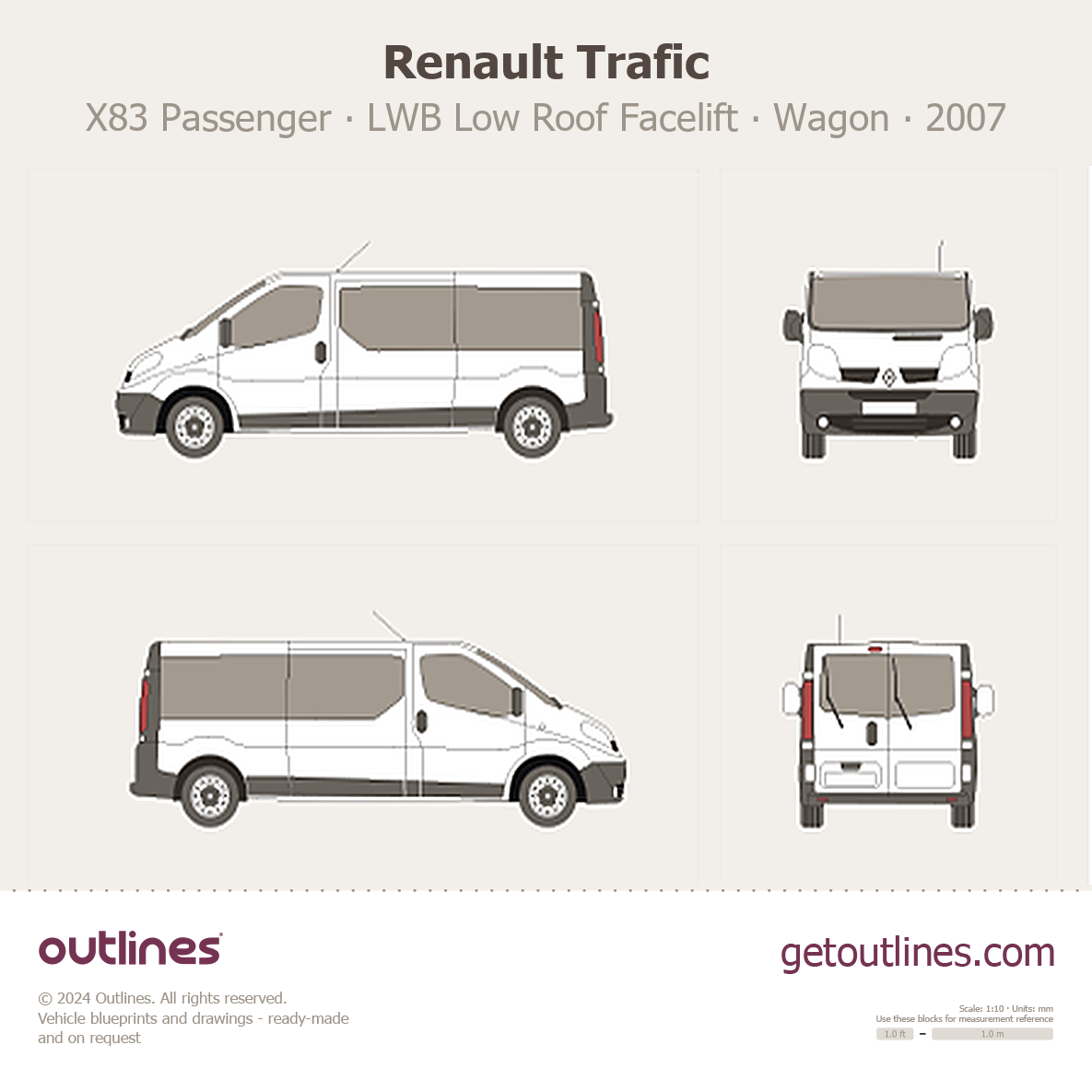 This 2007 Renault Trafic X83 Passenger LWB Low Roof Facelift Wagon blueprint helps designers, wrap studios, and 3D artists simplify their workflow and save valuable time for creative work instead of routine tasks.