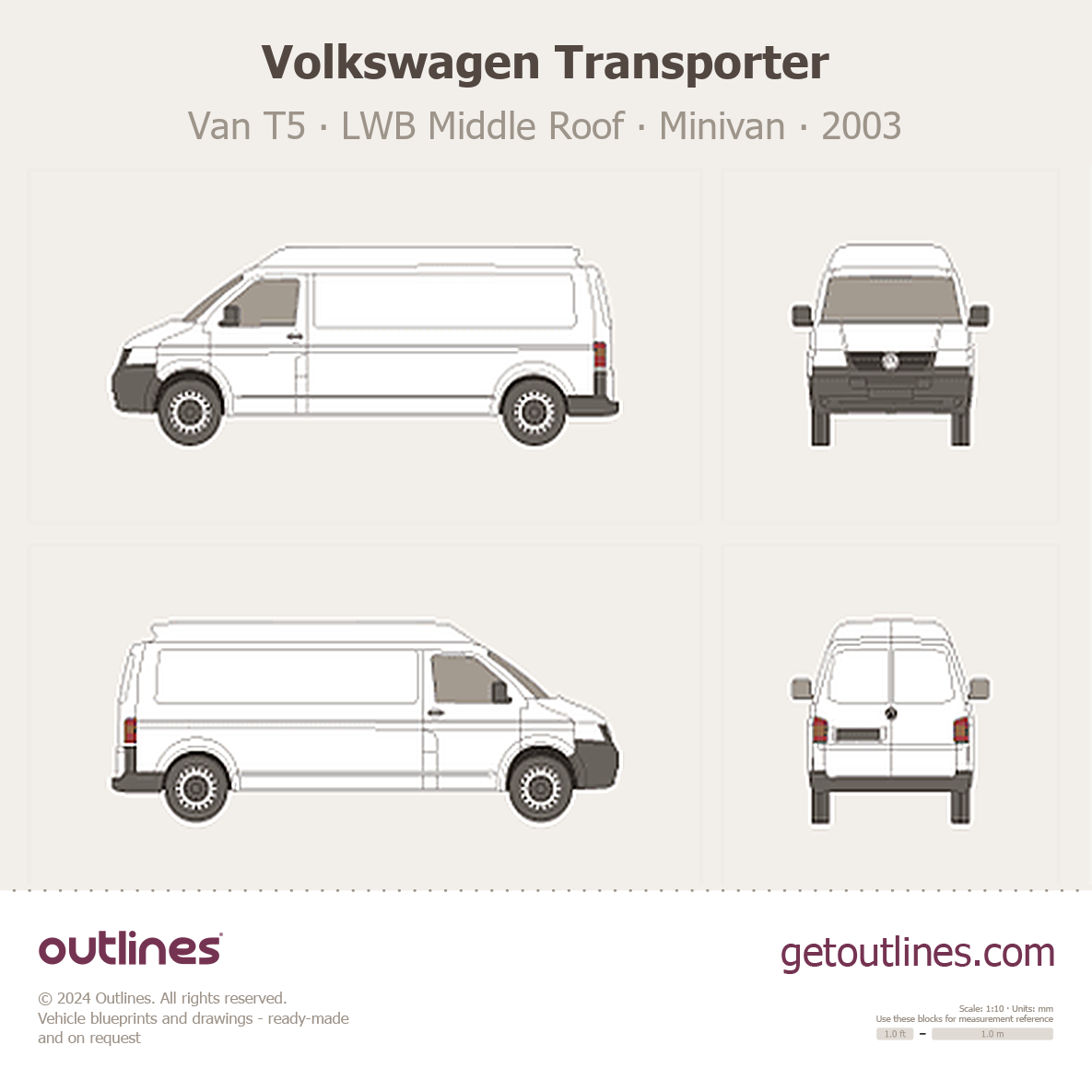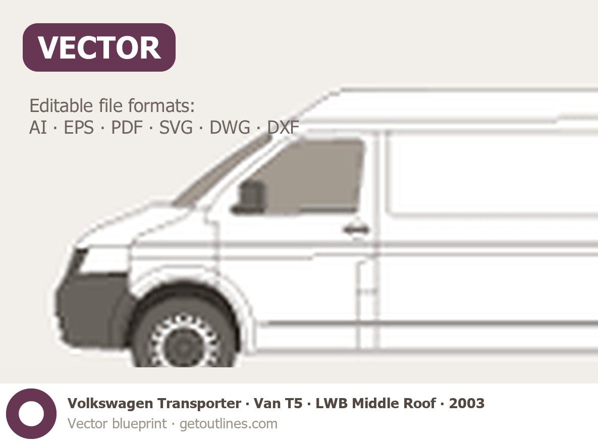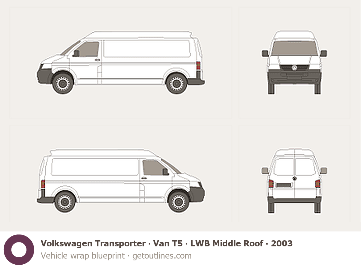This 2003 Volkswagen Transporter Van T5 LWB Middle Roof Minivan blueprint helps designers, wrap studios, and 3D artists simplify their workflow and save valuable time for creative work instead of routine tasks.