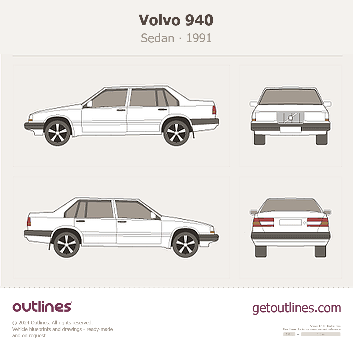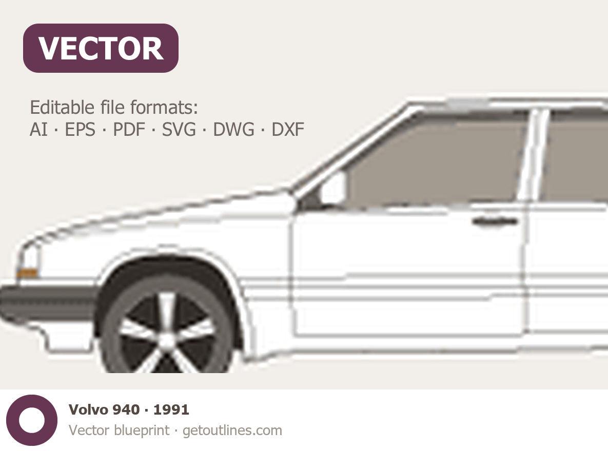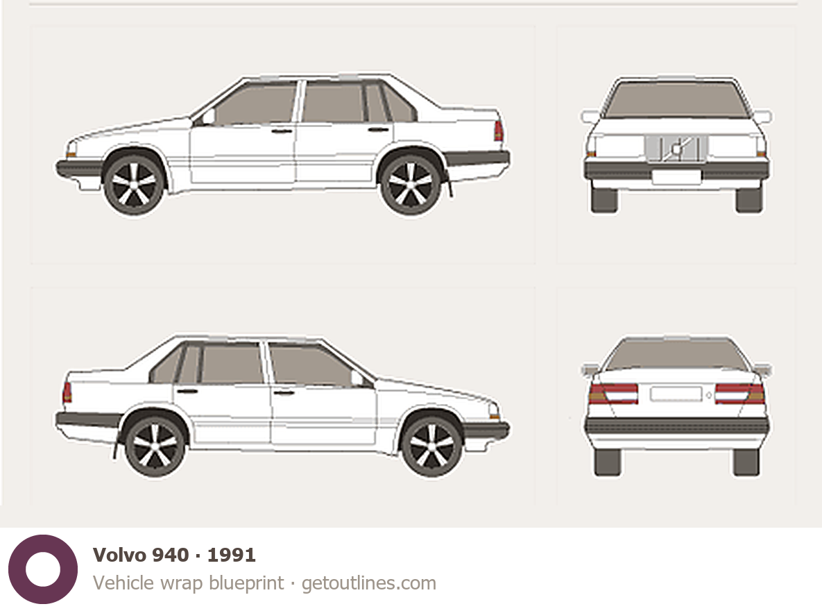 This 1991 Volvo 940 Sedan blueprint helps designers, wrap studios, and 3D artists simplify their workflow and save valuable time for creative work instead of routine tasks.