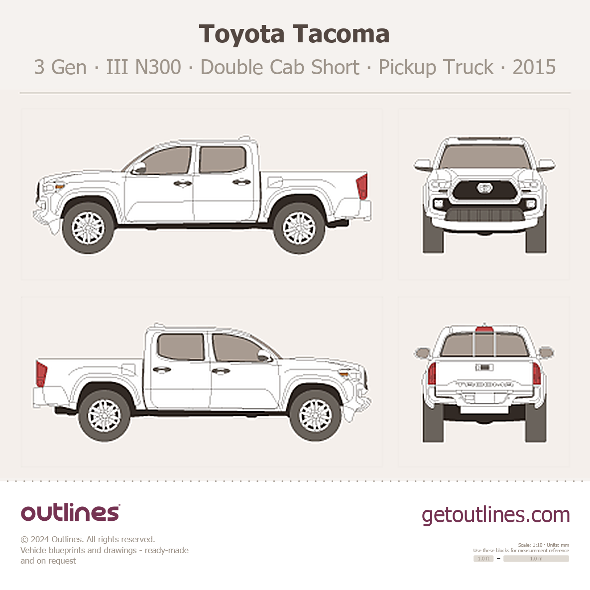 This is a blueprint of the Tacoma, produced by carmaker Toyota in 2015 - Present (2025, 2026). It features a Pickup Truck body design and is classified as a Commercial vehicle.
