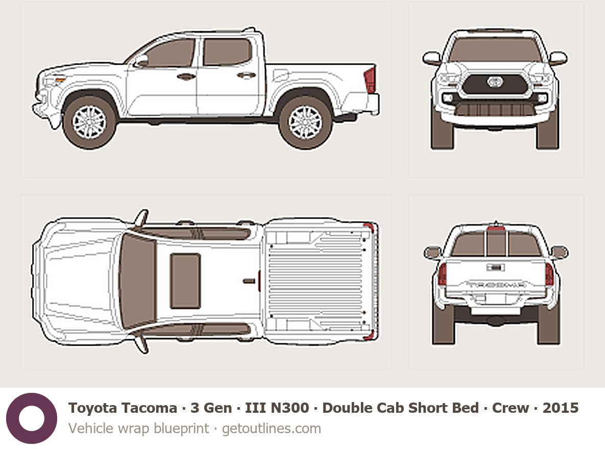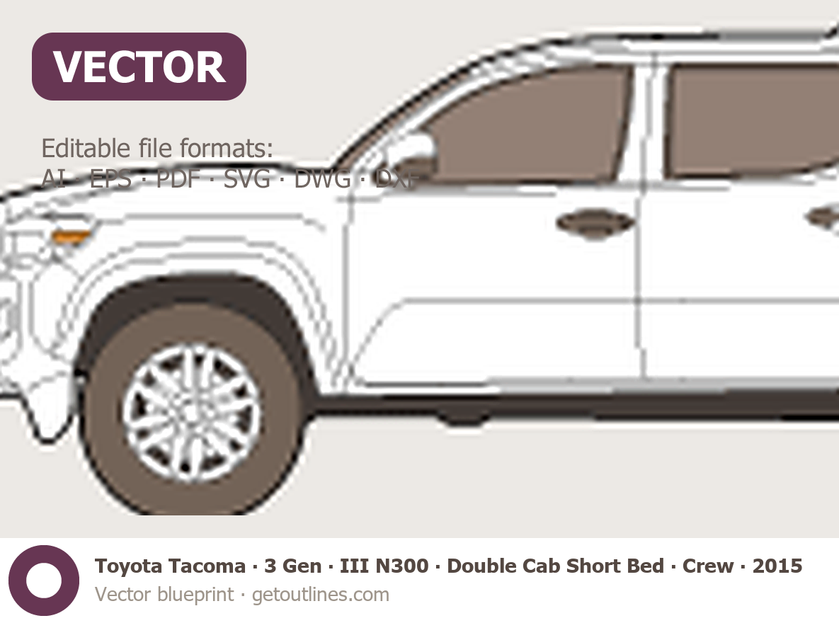 This 2015 Toyota Tacoma 3 Gen ∙ III N300 Double Cab Short Bed ∙ Crew Cab Pickup Truck blueprint helps designers, wrap studios, and 3D artists simplify their workflow and save valuable time for creative work instead of routine tasks.