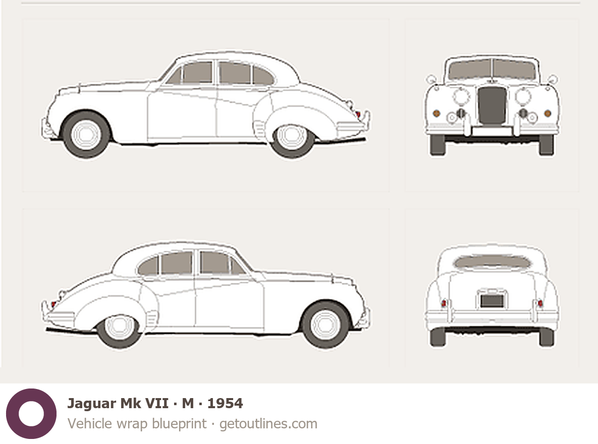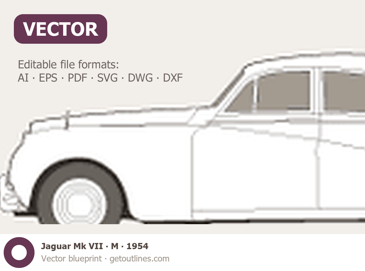 Buy this Jaguar Mk VII M blueprint and line drawing in high-quality editable vector file formats. Best for 3D and car wrap design.