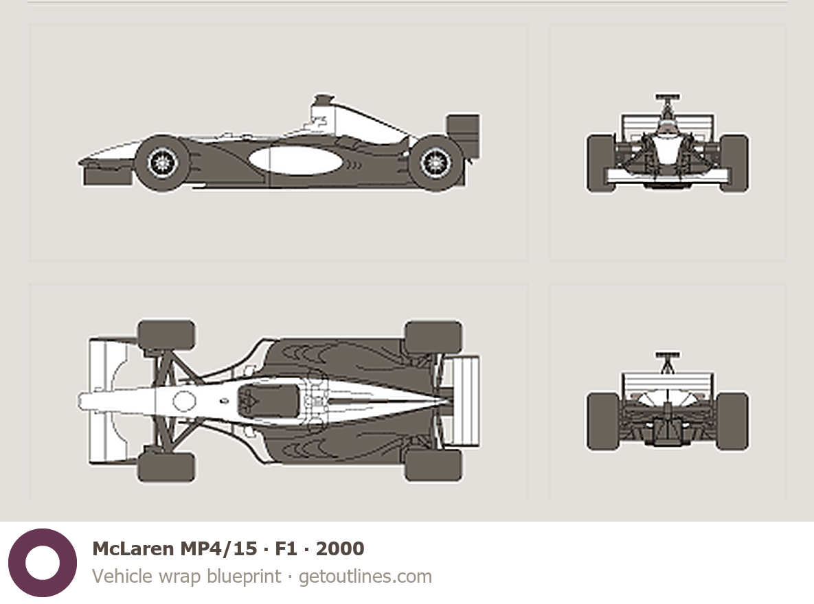 Buy this McLaren MP4/15 F1 blueprint and line drawing in high-quality editable vector file formats. Best for 3D and car wrap design.