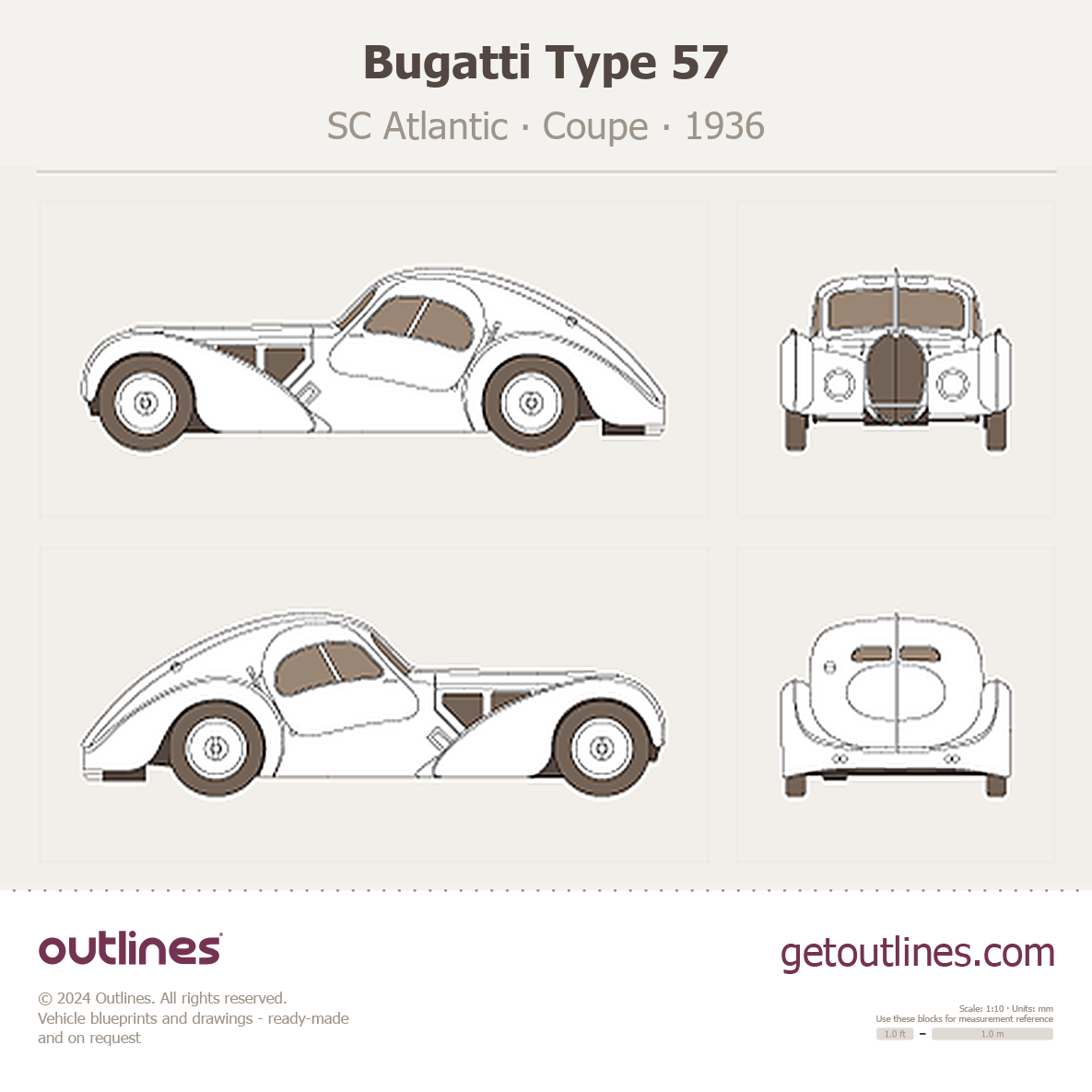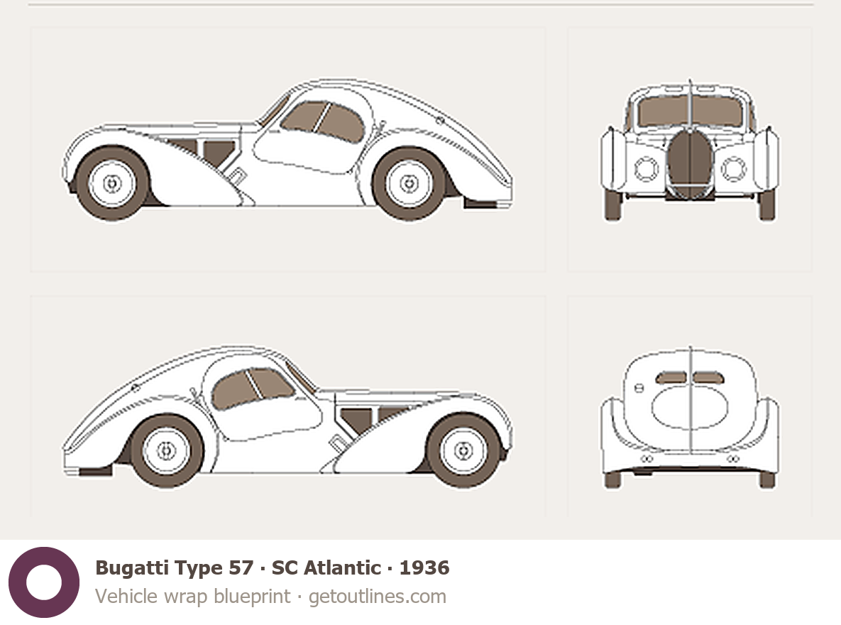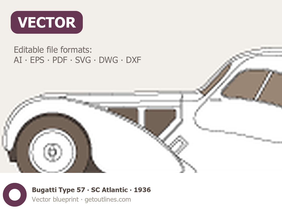 Buy this Bugatti Type 57 SC Atlantic blueprint and line drawing in high-quality editable vector file formats. Best for 3D and car wrap design.