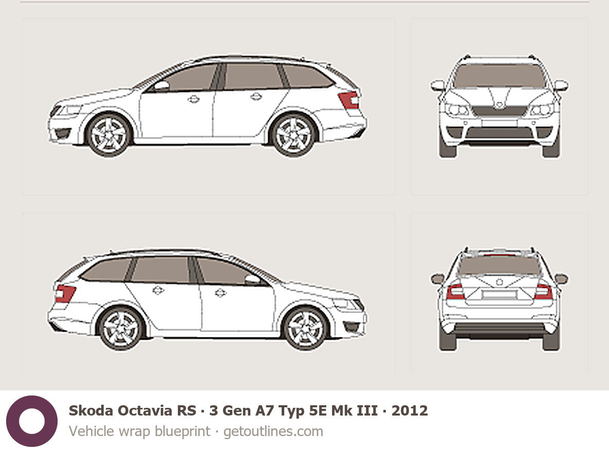 This 2012 Skoda Octavia RS 3 Gen A7 Typ 5E Mk III Hatchback blueprint helps designers, wrap studios, and 3D artists simplify their workflow and save valuable time for creative work instead of routine tasks.