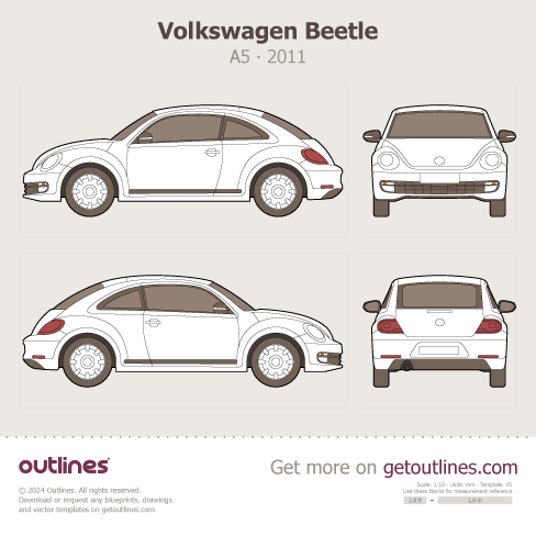 Buy this Volkswagen Beetle 2 Gen ∙ A5 blueprint and line drawing in high-quality editable vector file formats. Best for 3D and car wrap design.