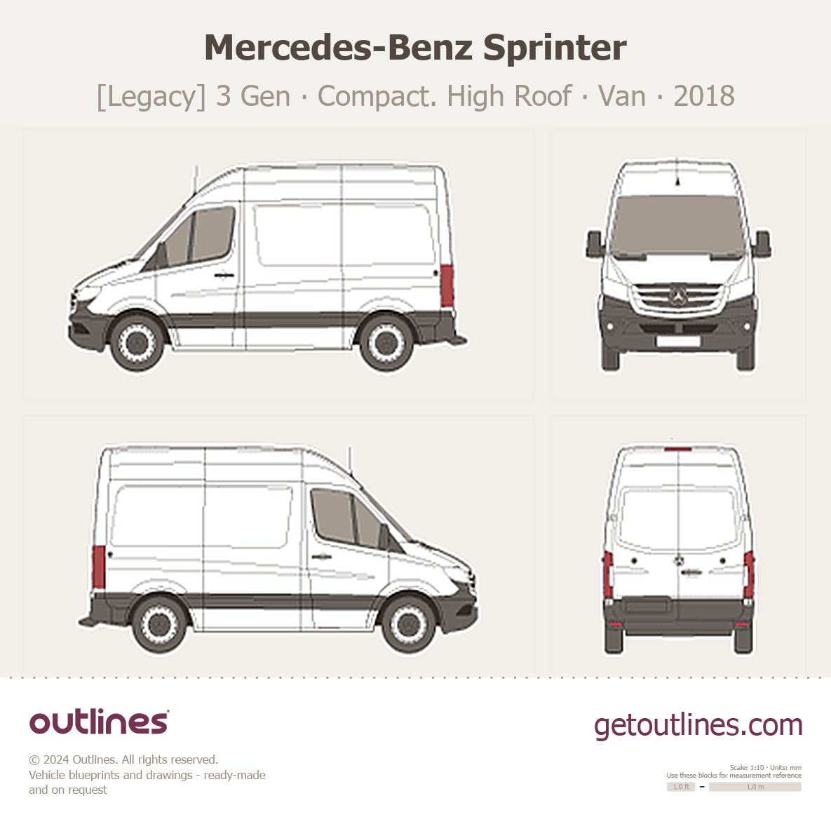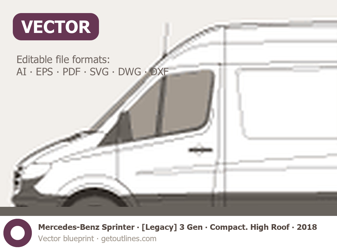 This 2018 Mercedes-Benz Sprinter [Legacy] 3 Gen Compact. High Roof Van blueprint helps designers, wrap studios, and 3D artists simplify their workflow and save valuable time for creative work instead of routine tasks.