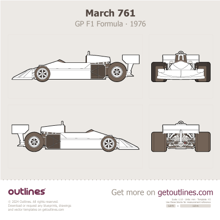 This is a blueprint of the 761, produced by carmaker March in 1976 - 1976. It features a Formula body design and is classified as a Racing vehicle.