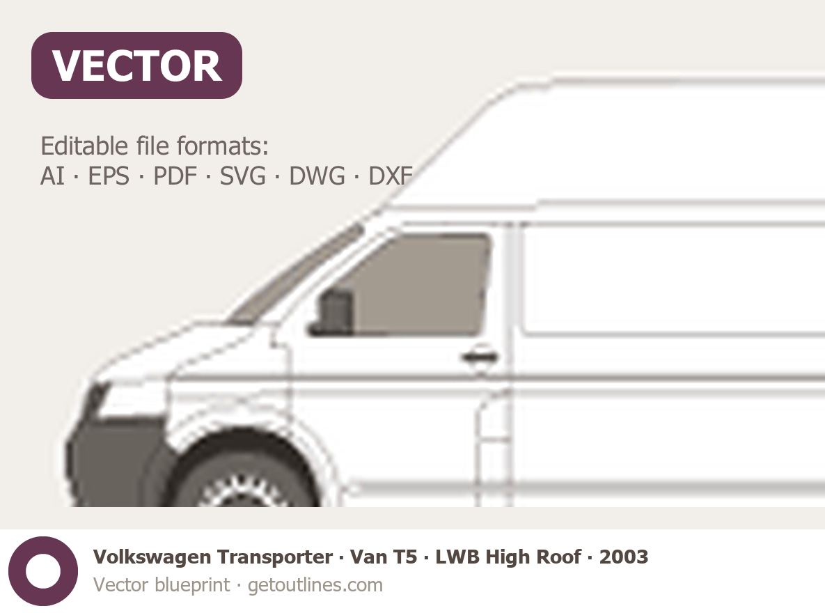 This 2003 Volkswagen Transporter Van T5 LWB High Roof Minivan blueprint helps designers, wrap studios, and 3D artists simplify their workflow and save valuable time for creative work instead of routine tasks.