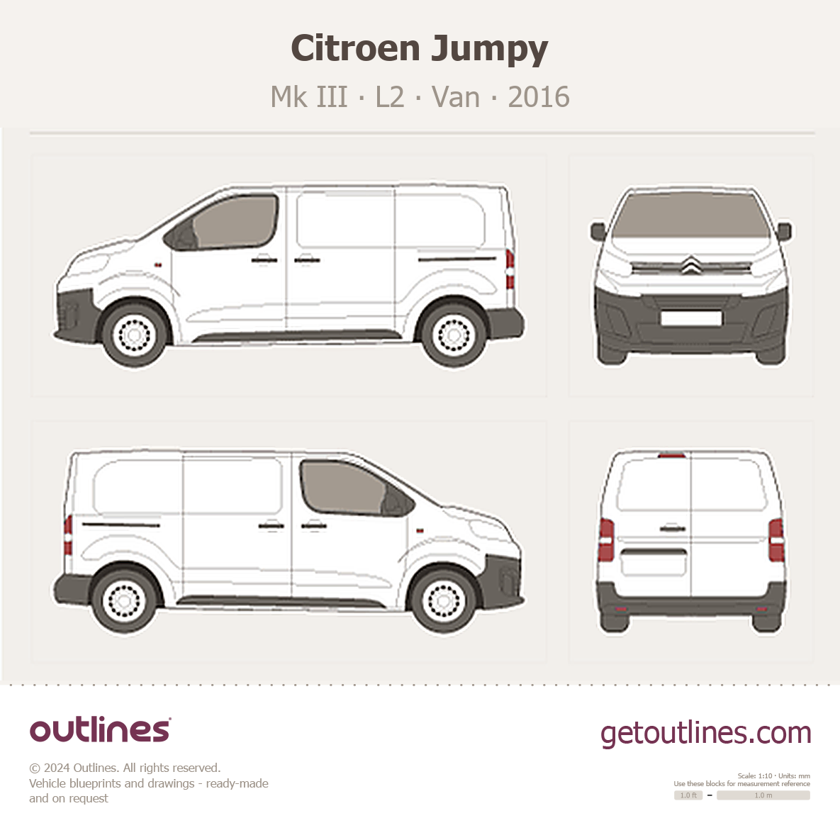 This is a blueprint of the Jumpy, produced by carmaker Citroen in 2016 - Present (2025, 2026). It features a Van body design and is classified as a Commercial vehicle.