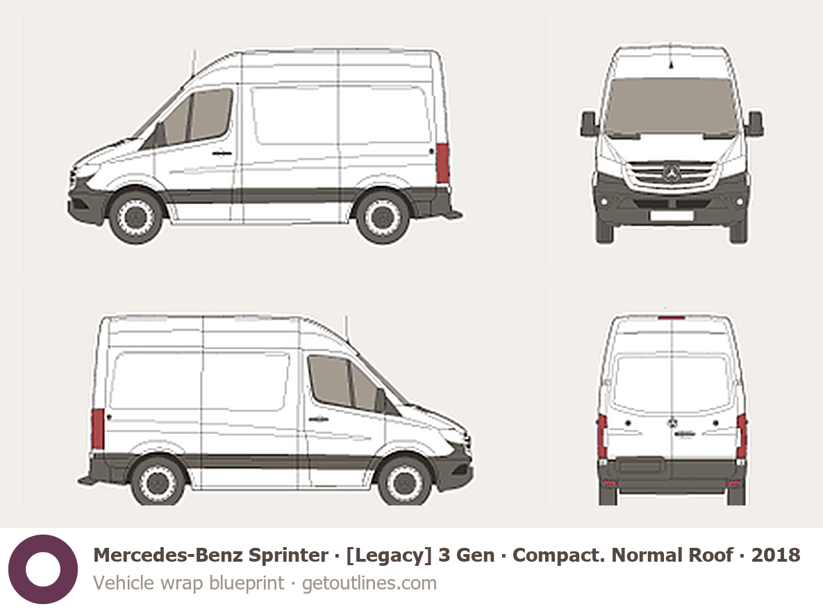 This 2018 Mercedes-Benz Sprinter [Legacy] 3 Gen Compact. Normal Roof Minivan blueprint helps designers, wrap studios, and 3D artists simplify their workflow and save valuable time for creative work instead of routine tasks.