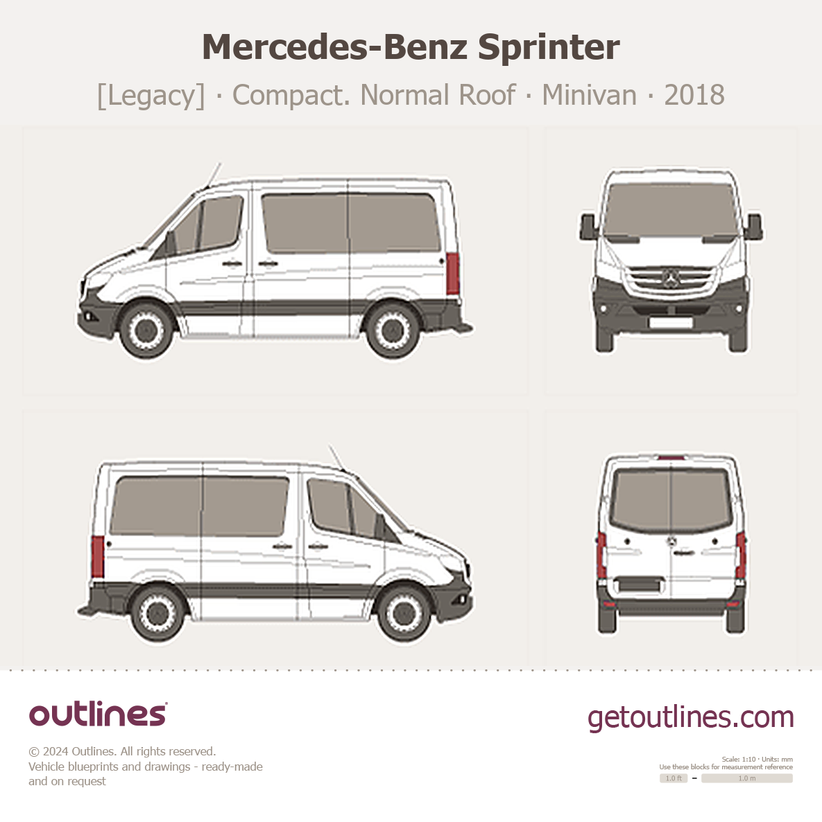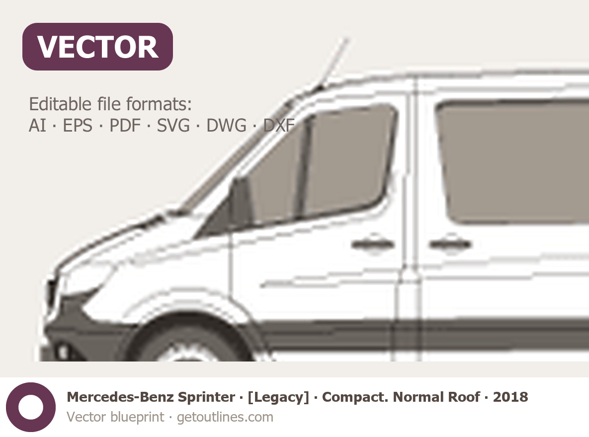 This 2018 Mercedes-Benz Sprinter [Legacy] Compact. Normal Roof Minivan blueprint helps designers, wrap studios, and 3D artists simplify their workflow and save valuable time for creative work instead of routine tasks.